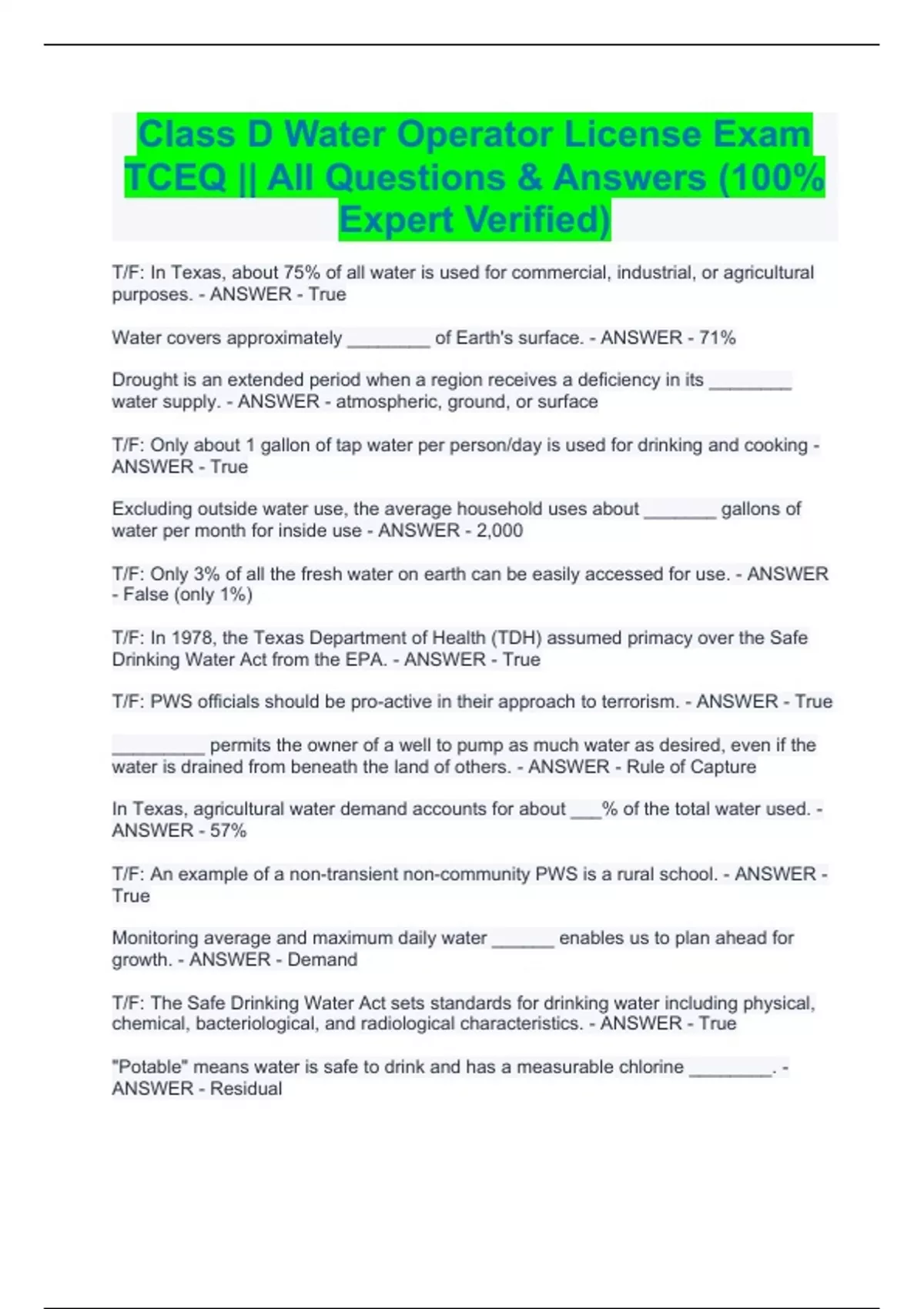 Texas Class D Water Distribution Licensing Exam BUNDLE (2024) || With Complete Questions & Answers (Expert Rated A+)