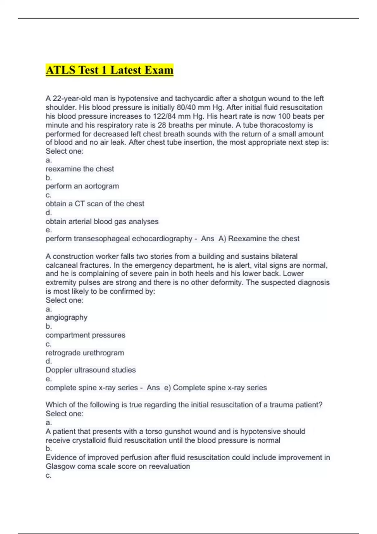 ATLS practice 2022 Questions With All the Correct Answers ATLS study cards With Complete Solution ATLS Written Review Latest 2021 Graded A ATLS Test 1 Latest With Complete Solution