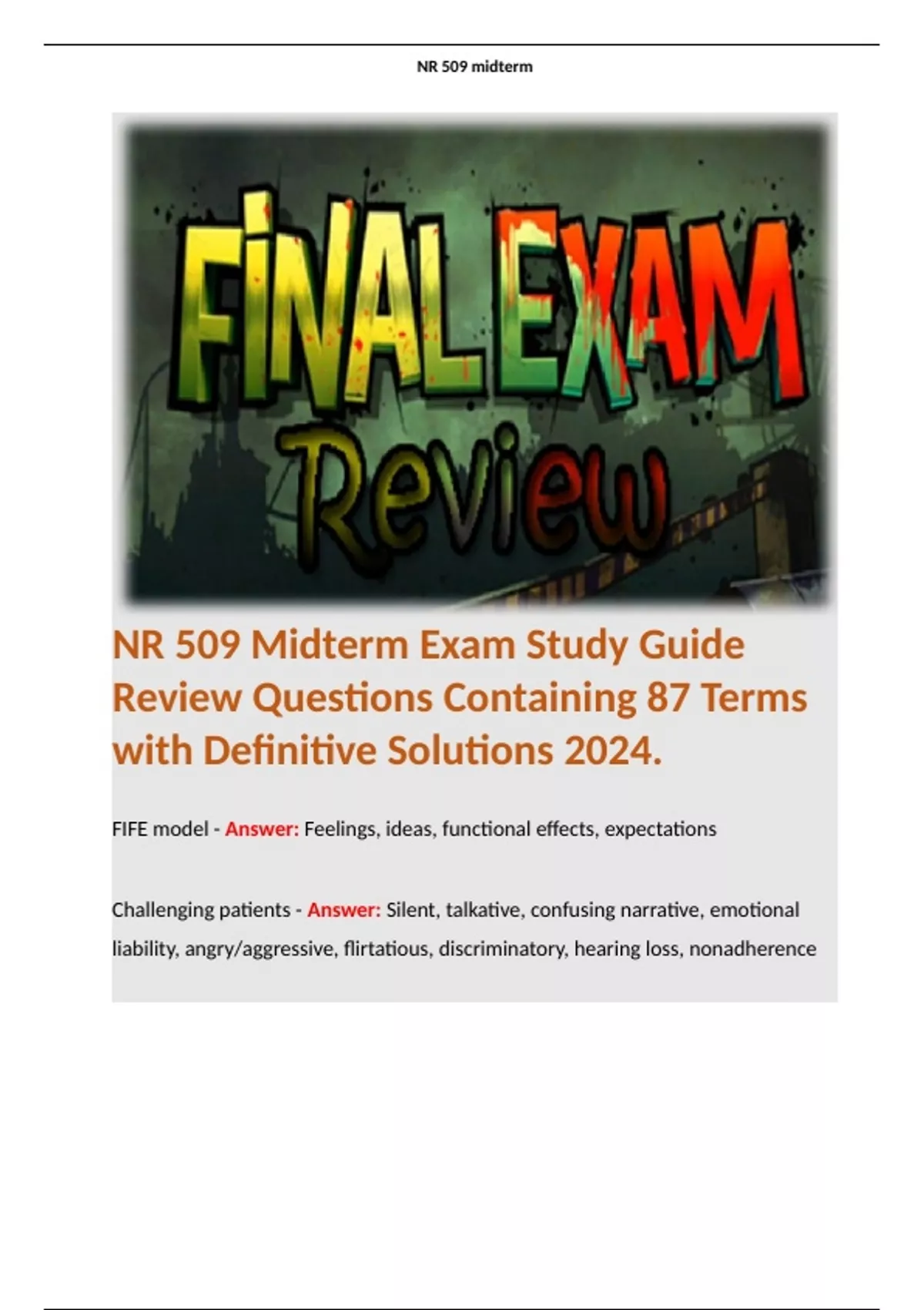 1 Exam (elaborations) NR509 Final TD Study Guide Exam Review Questions (73 Terms) with Certified Answers 2024. 2 Exam (elaborations) NR509 final Exam Questions Containing 75 Terms with Definitive Solutions 2024. 3 Exam (elaborations) NR 509 Final Exam Containing 206 Questions and Answers/ Already Graded A+ 2024. 4 Exam (elaborations) NR 509 Midt