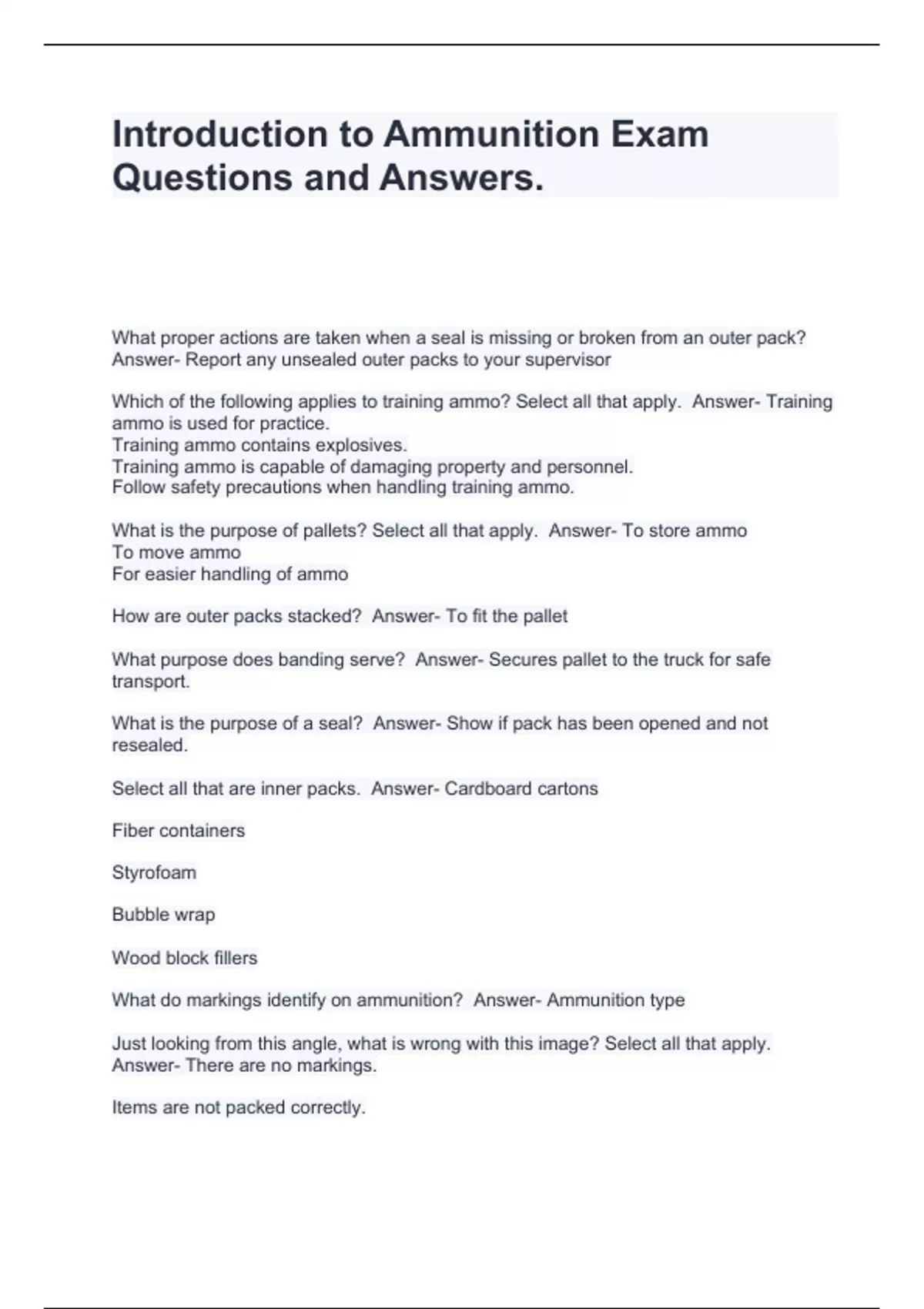 AMMO 49 Exam Questions and Answers,Ammo 64 Exam Questions and Answers,Ammo Handler Exam Questions and Answers,Ammo Handler Exam Questions and Answers,Ammo Handler Exam Questions and Correct Answers,Ammo Physical Security Exam Questions and AnswersAMMO-45 Exam Questions and Answers,Ammo-45-DL- Introduction to Ammunition Exam Questions and Answers, ,