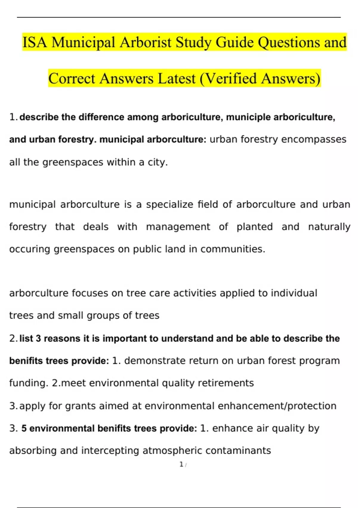 ISA Municipal Arborist Study Guide Questions and Answers Latest (Verified Answers)