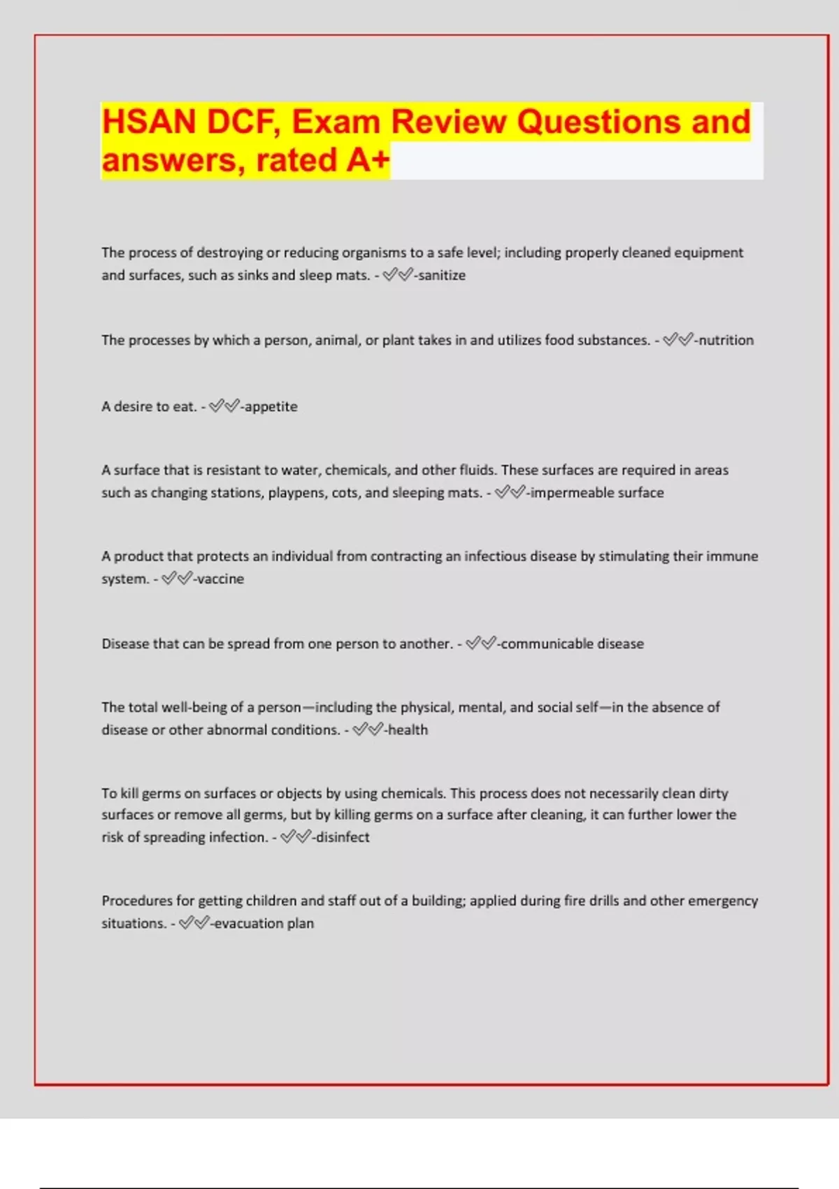 DCF Health, Saftey, & Nutrition (HSAN), Questions and answers, rated A+
