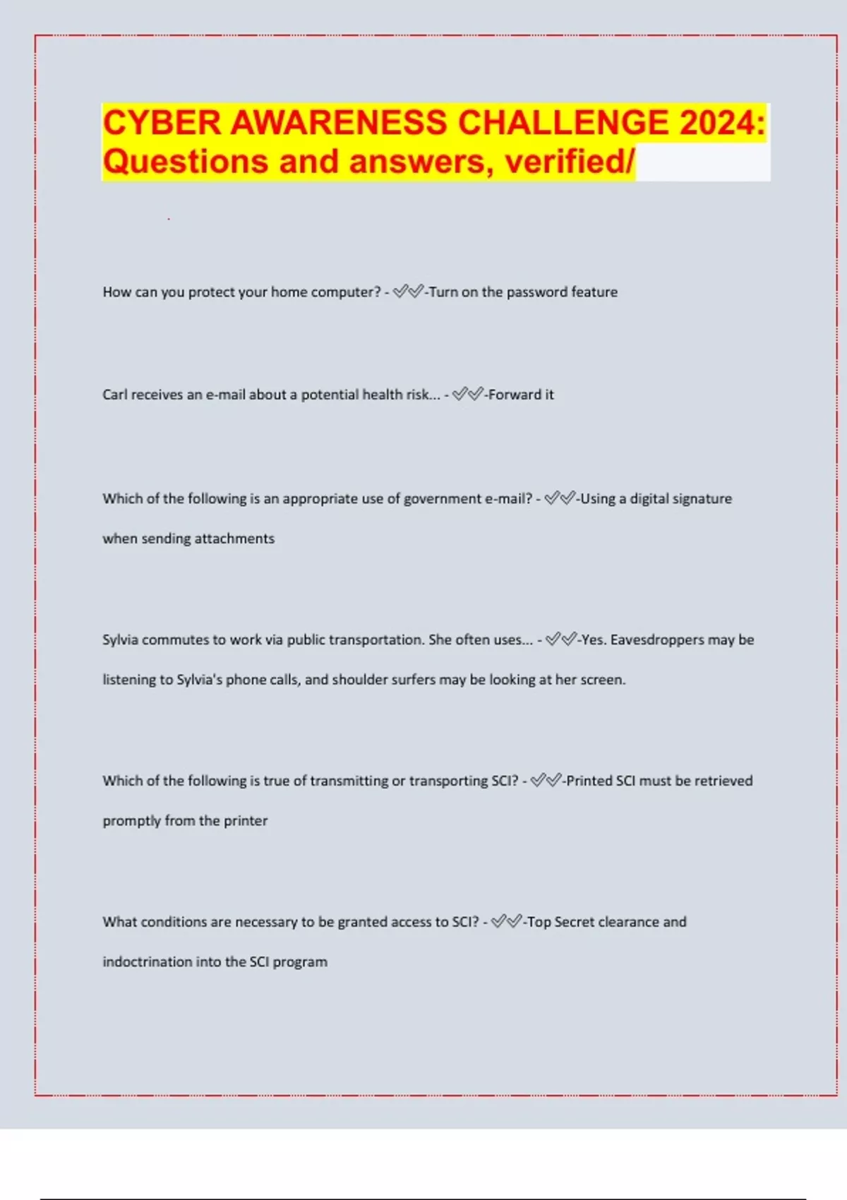 Cyber awareness 2024: Review Questions and answers. Verified/ / 2024-25 Exam board exam predictions. APPROVED/