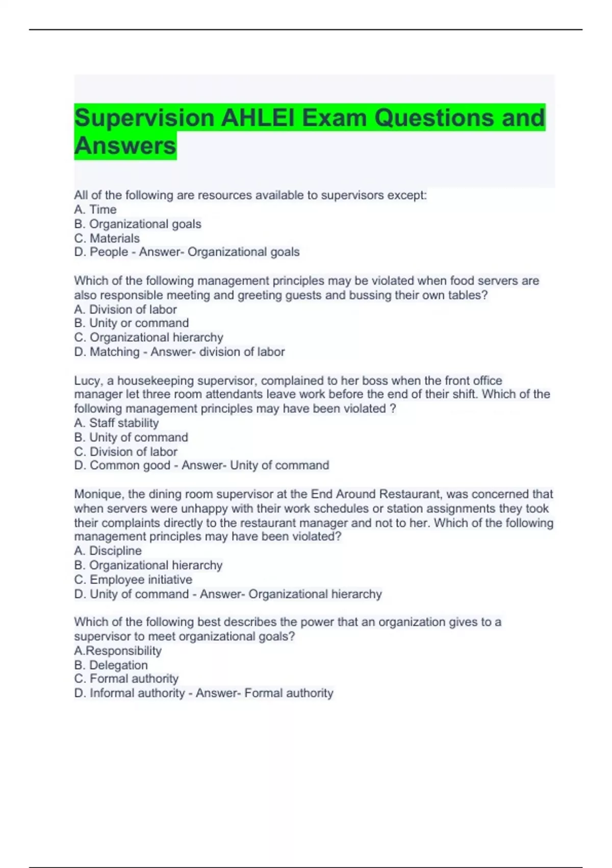 1 Exam (elaborations) Supervision AHLEI Exam Questions and Answers 2024/ Graded A 2 Exam (elaborations) Marketing and Sales AHLEI Exam 2024 with correct Answers 3 Exam (elaborations) Hotel Lodging FINAL EXAM Questions and Answers - Graded A 4 Exam (elaborations) AHLEI STUDY GUIDE QUESTIONS AND ANSWERS 2024 5 Exam (elaborations) AHLEI Marketing