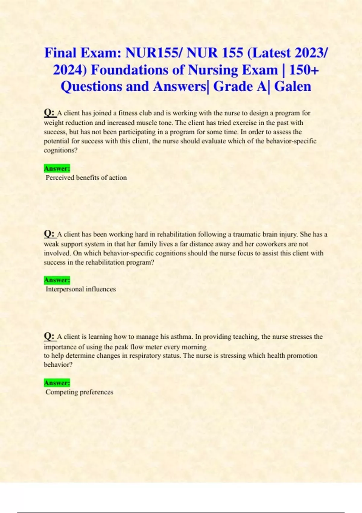 Final Exams: NUR155/ NUR 155 (Latest 2024/ 2025 Updates STUDY BUNDLE WITH COMPLETE SOLUTIONS ) Foundations of Nursing Exam Reviews| Questions and Answers| Grade A| Galen
