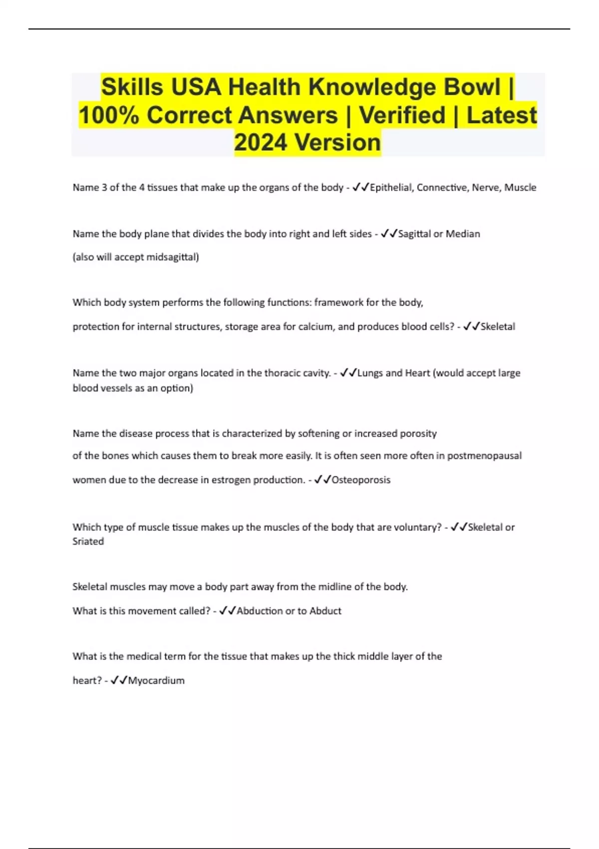 Health Knowledge Bowl (SkillsUSA) 100% Correct Answers | Verified | Latest 2024 Version