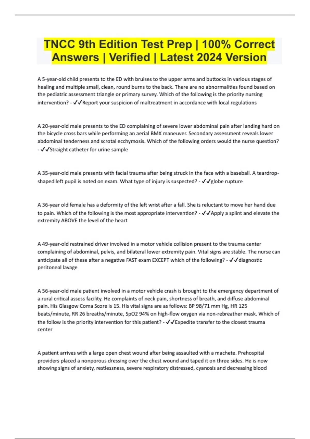 TNCC 9th Edition Test Prep | 100% Correct Answers | Verified | Latest 2024 Version