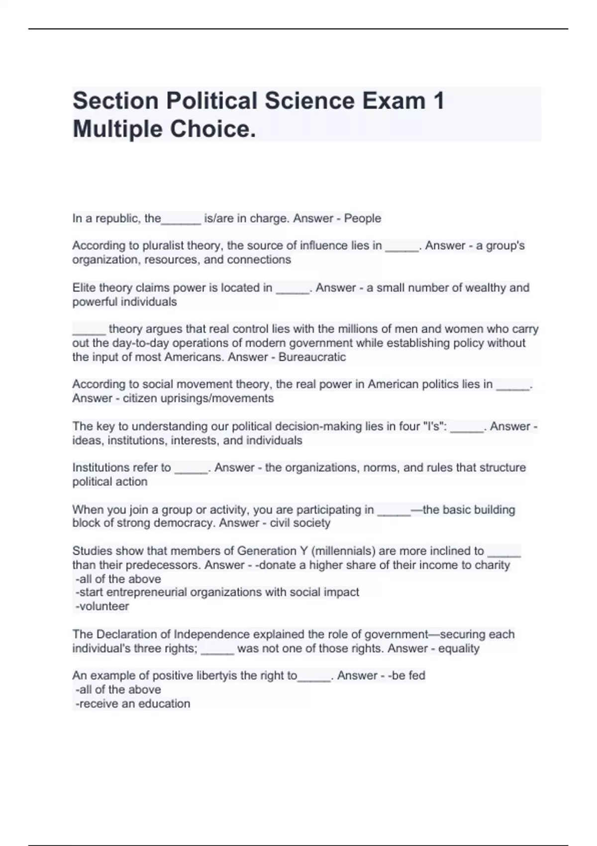 GACE- Political Science Exam Questions and Answers,Intro to Political Science Exam 3 Questions and Answers,James Stoner Political Science 1001 Exam 2 Questions and Answers,PLSC 1 PSU Exam 1 Questions and Answers,Political Sci 104 Exam 2 Questions and Answers,Political Science (Final Exam) Questions and Answers,