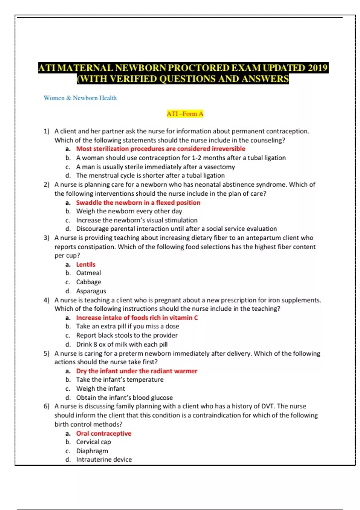ATI MATERNAL NEWBORN EXAM LATEST UPDATED 2024 2 Exam (elaborations) 2023 RN ATI MATERNAL HEALTH PROCTORED EXAM WITH NGN 3 Exam (elaborations) ATI MATERNAL NEWBORN 2019 FORUM A-D WITH 100% CORRECT QUESTIONS AND ANSWERS 4 Exam (elaborations) ATI Maternal Newborn Exam 1 With Good Organised Questions And Answers 5 Exam (elaborations) ATI MATERNAL