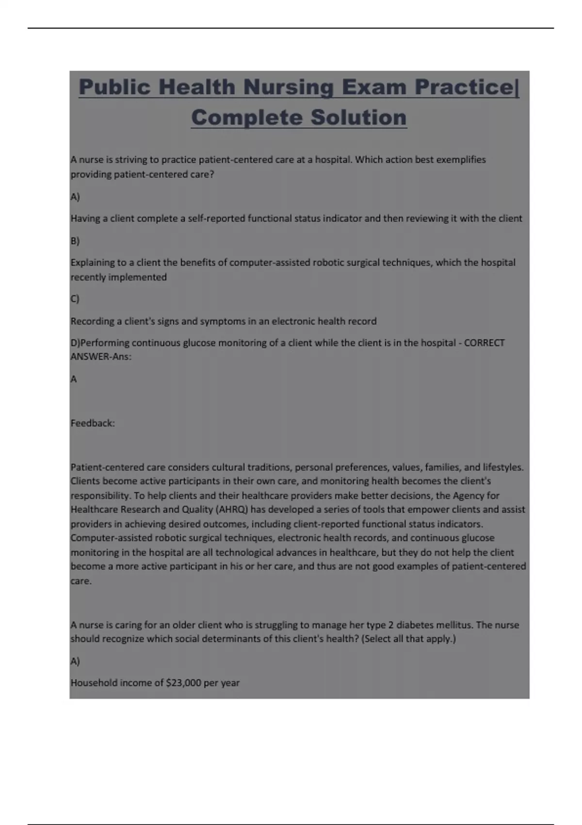 Public Health Nursing Exam Practice| Complete Solution Population And Community Health Nursing Proctored Exam| 100% Correct Answers Public Health Nursing Exam Practice| Complete Solution Population And Community Health Nursing Proctored Exam| 100% Correct Answers Public Health Nursing Based On Improvement Of Population Health| Study Guide Exam Foun