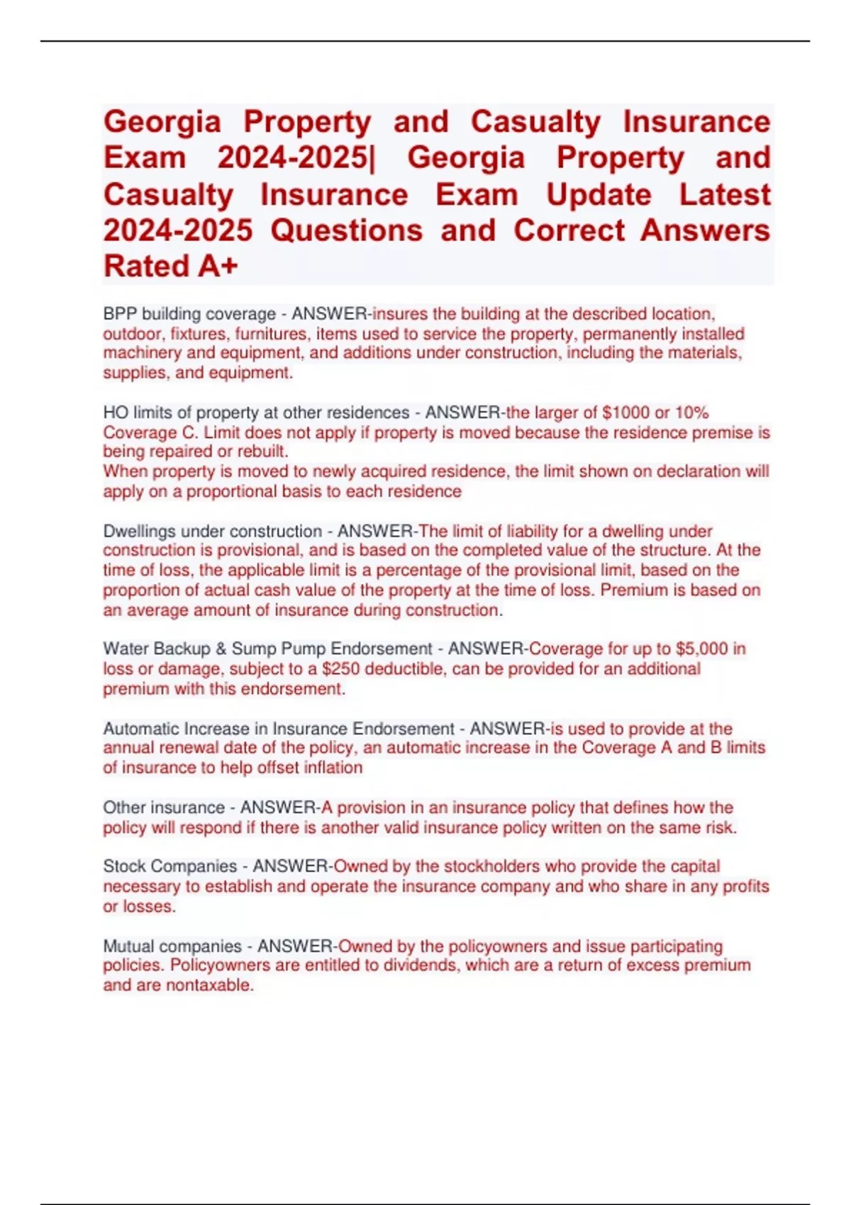 Insurance Property and Casualty Exam Update | Property and Casualty Insurance Exam Update Latest Questions and Correct Answers Rated A+