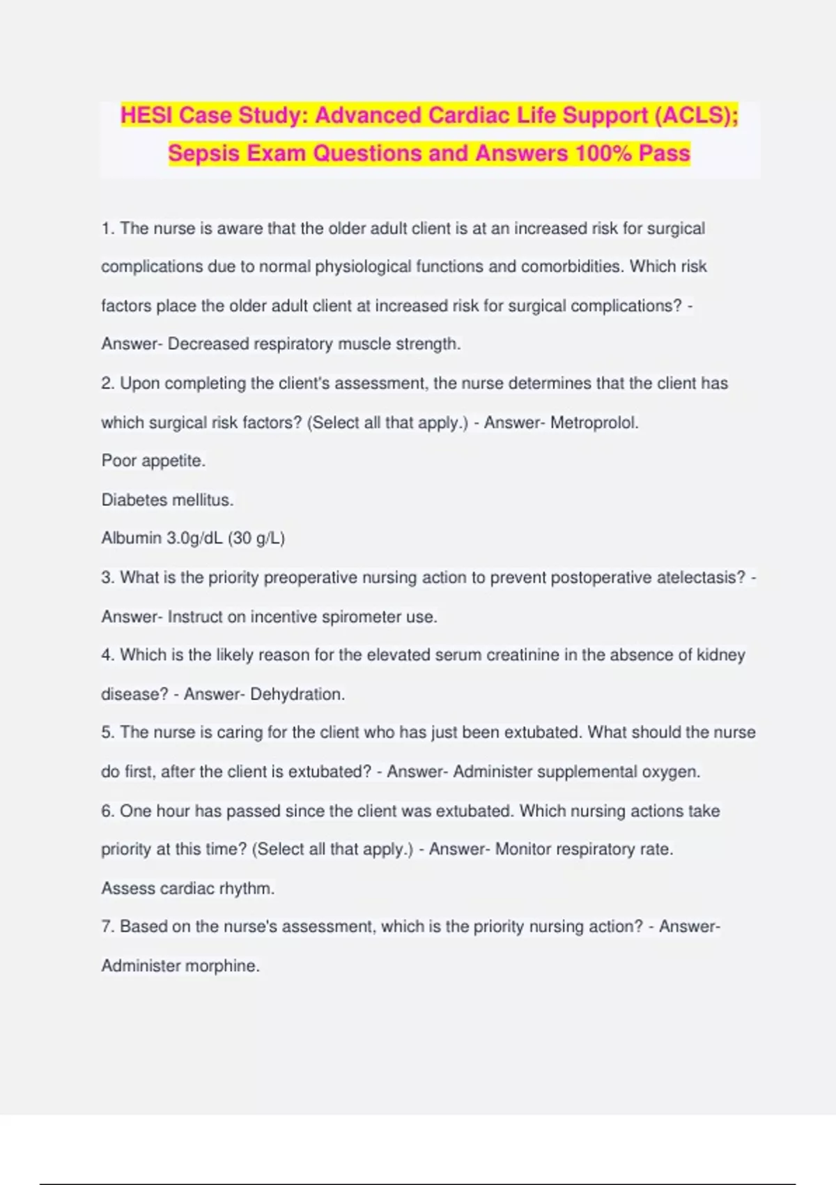 HESI Case Study: Advanced Cardiac Life Support (ACLS); Sepsis Exam Questions and Answers 100% Pass