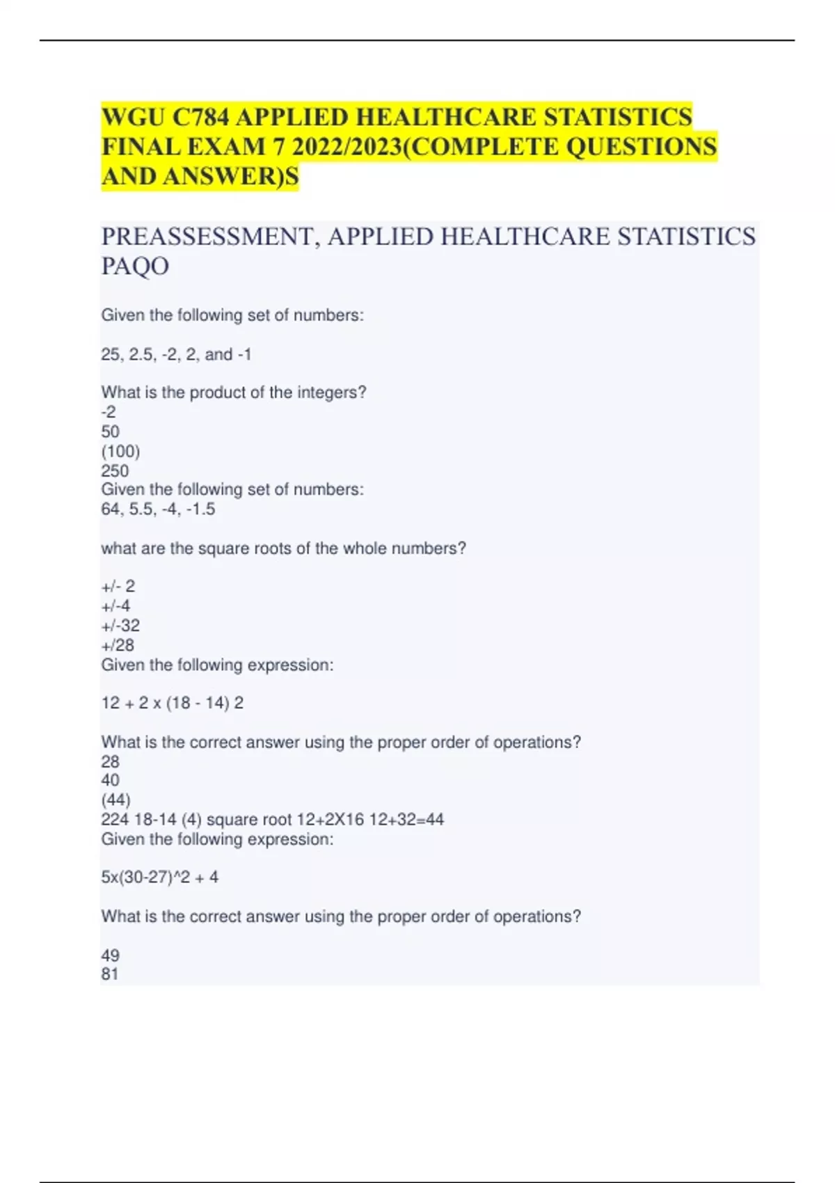 WGU C784 APPLIED HEALTHCARE STATISTICS FINAL EXAM 7 2022/2023(COMPLETE QUESTIONS AND ANSWER)S