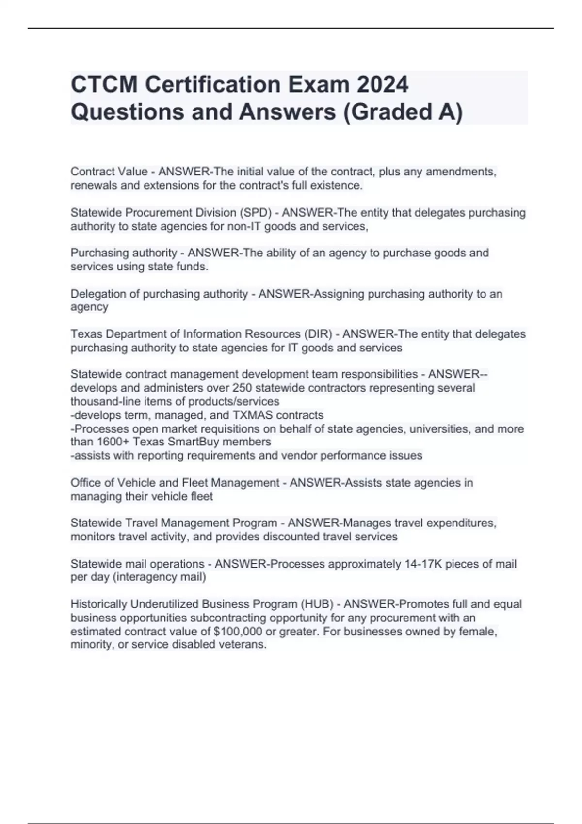 CTCM - Certified Texas Contract Management Exams BUNDLED (COMPLETE PACKAGE)Questions and Answers 100% Verified