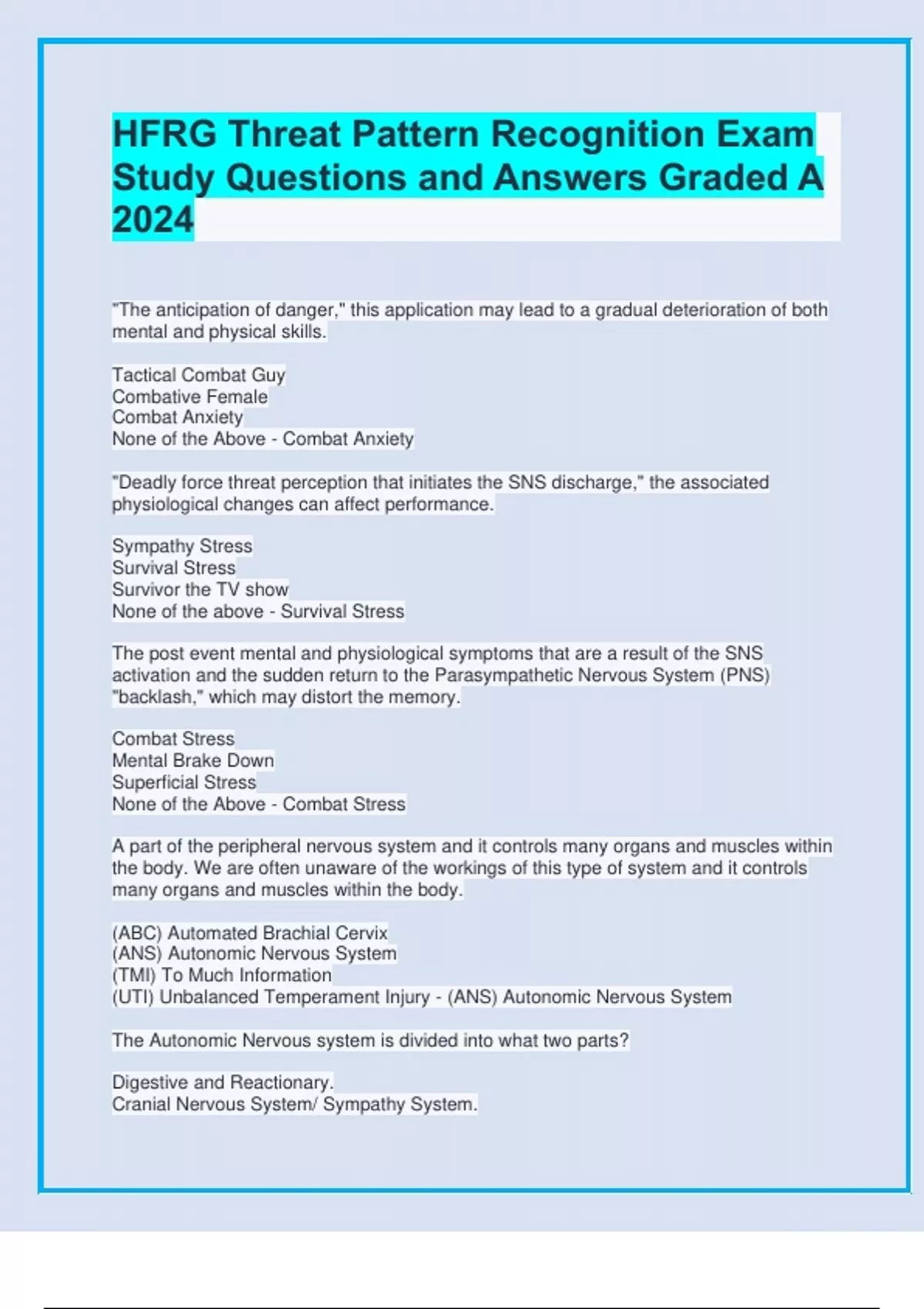 HFRG Threat Pattern Recognition Exam Study Questions and Answers Graded A 2024