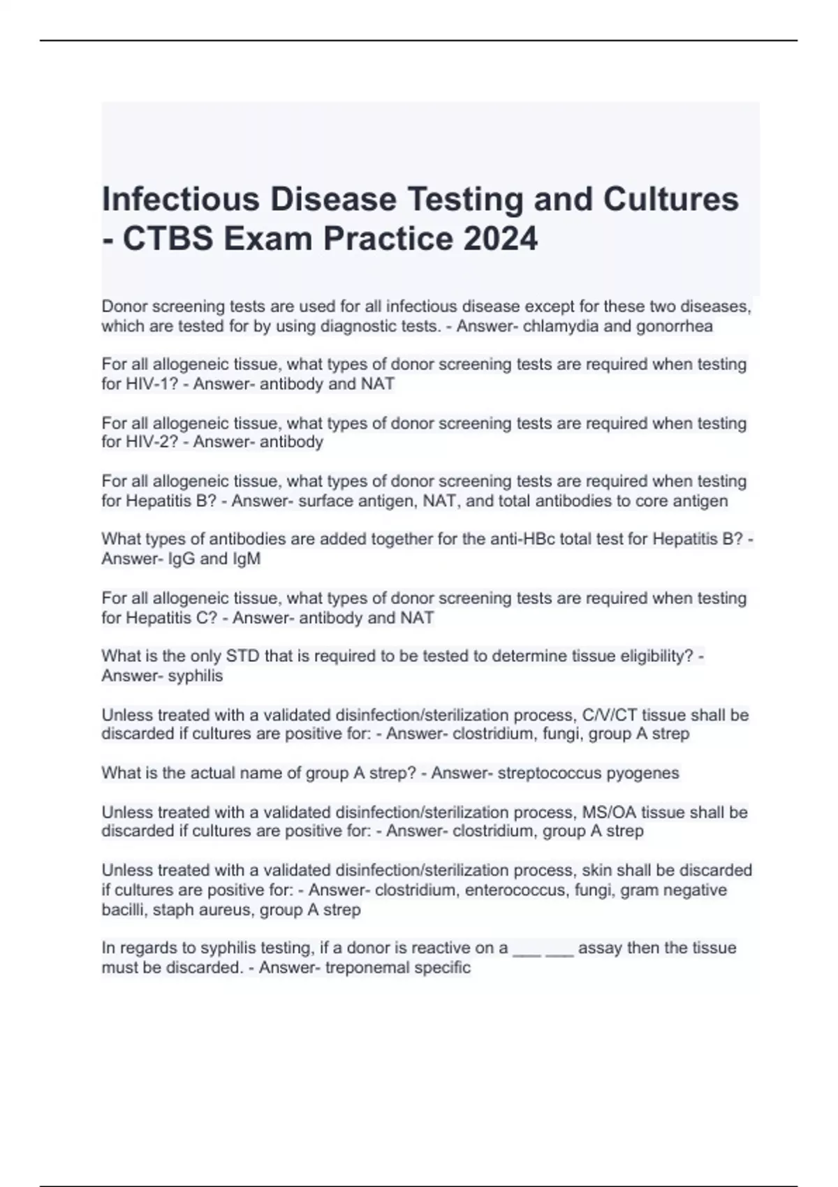 1 Exam (elaborations) Infectious Disease Testing and Cultures - CTBS Exam Practice 2024 Questions and Answers 2 Exam (elaborations) CTBS Vocabulary Exam Questions and Answers 2024/ Graded A 3 Exam (elaborations) CTBS Prep Course Sample Questions 2024 with correct Answers 4 Exam (elaborations) CTBS Practice Test Questions and Answers 100% correct