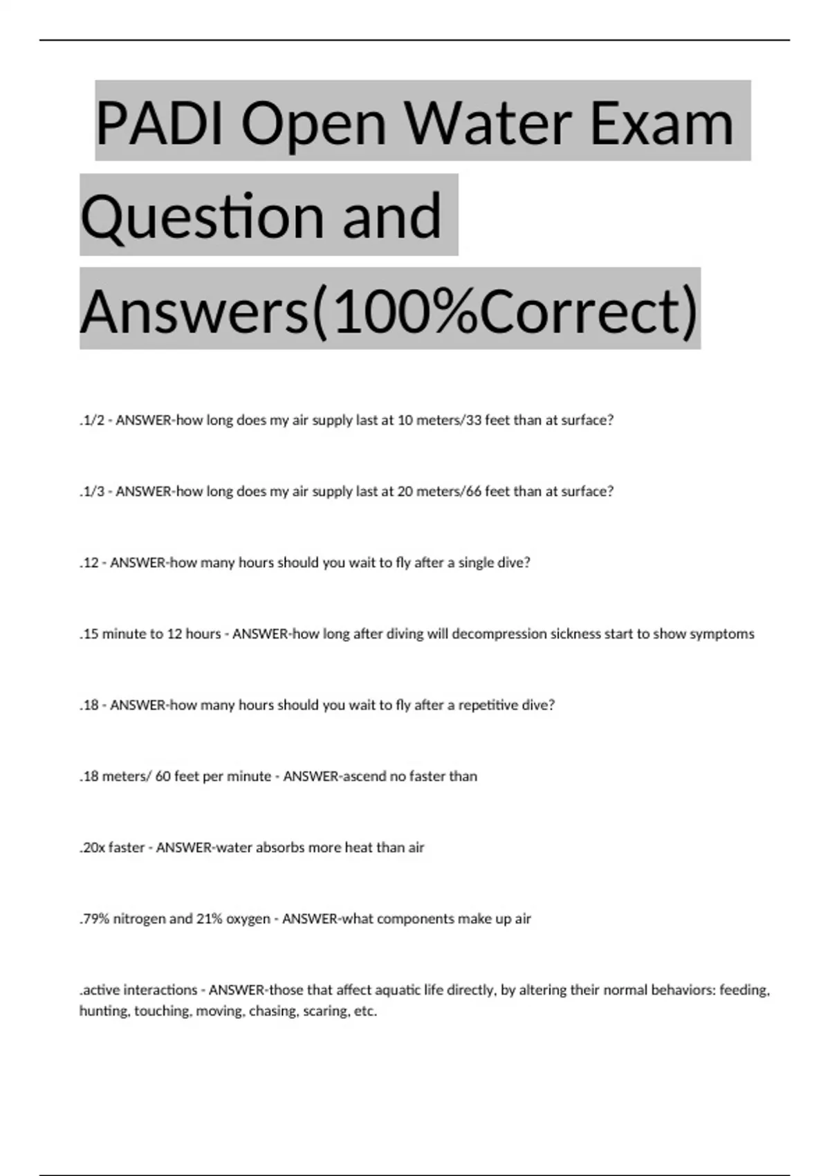 1 Exam (elaborations) Exam (elaborations) - Padi open water diver certification exam with 100% correct answers 2 Exam (elaborations) PADI Divemaster Questions and 100%Correct Answers 3 Exam (elaborations) PADI Divemaster Questions and Correct Answers 4 Exam (elaborations) PADI Open Water Diver Final Exam Questions and Answers (A