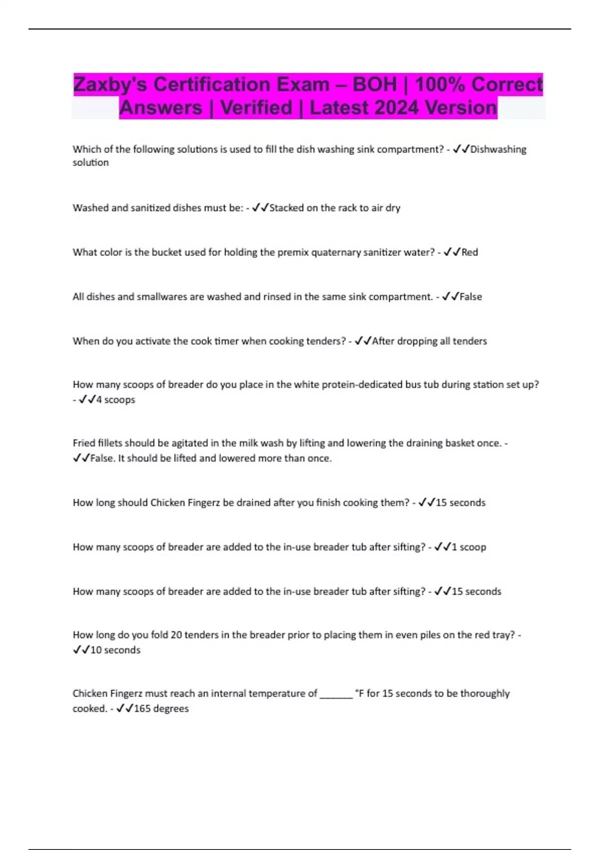 Zaxby's Certification Exam – BOH | 100% Correct Answers | Verified | Latest 2024 Version