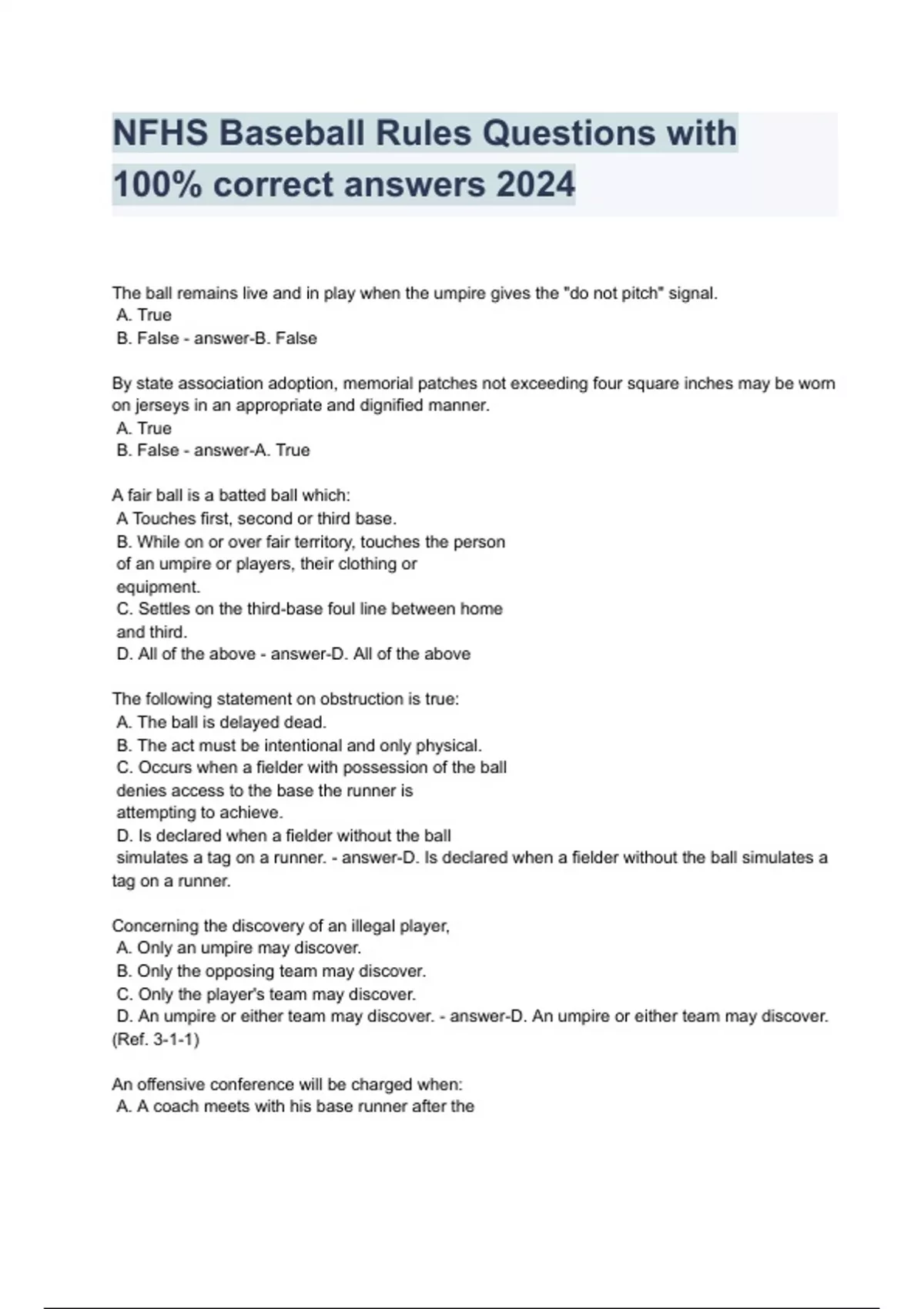 2024 NFHS Baseball Part I Test (WIAA) with 100% correct answers