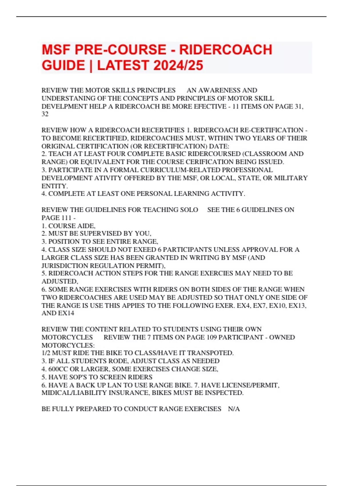 Exam (elaborations) MSF PRE-COURSE - RIDERCOACH GUIDE | LATEST 2024/25 2 Exam (elaborations) MSF RiderCoach prep 2024/25 | With complete solution | 3 Exam (elaborations) MSF Written Test Questions & Answers | 100% verified correct 2024/25 4 Exam (elaborations) MSF practice test | Latest 2024/25 5 Exam (elaborations) MSF Basic Rider Course Study