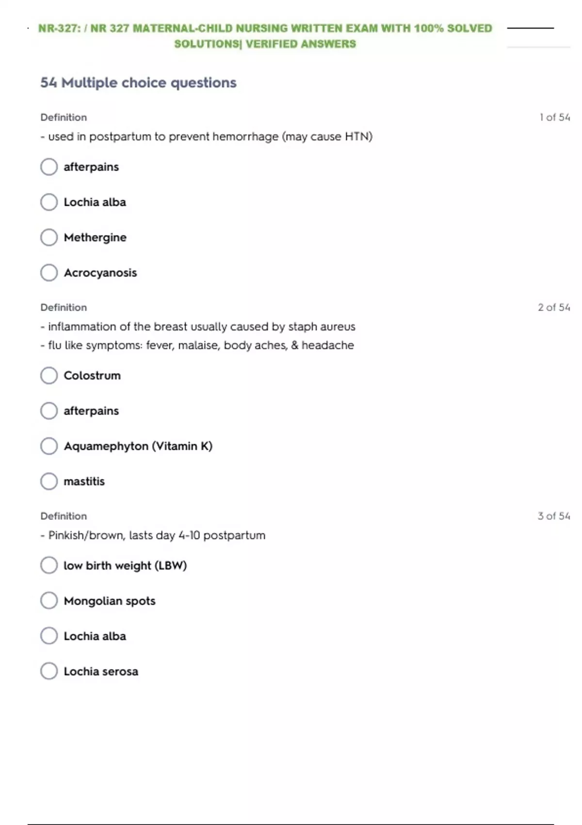 NR-327: | NR 327 MATERNAL-CHILD NURSING WRITTEN EXAM WITH 100% SOLVED SOLUTIONS| VERIFIED ANSWERS