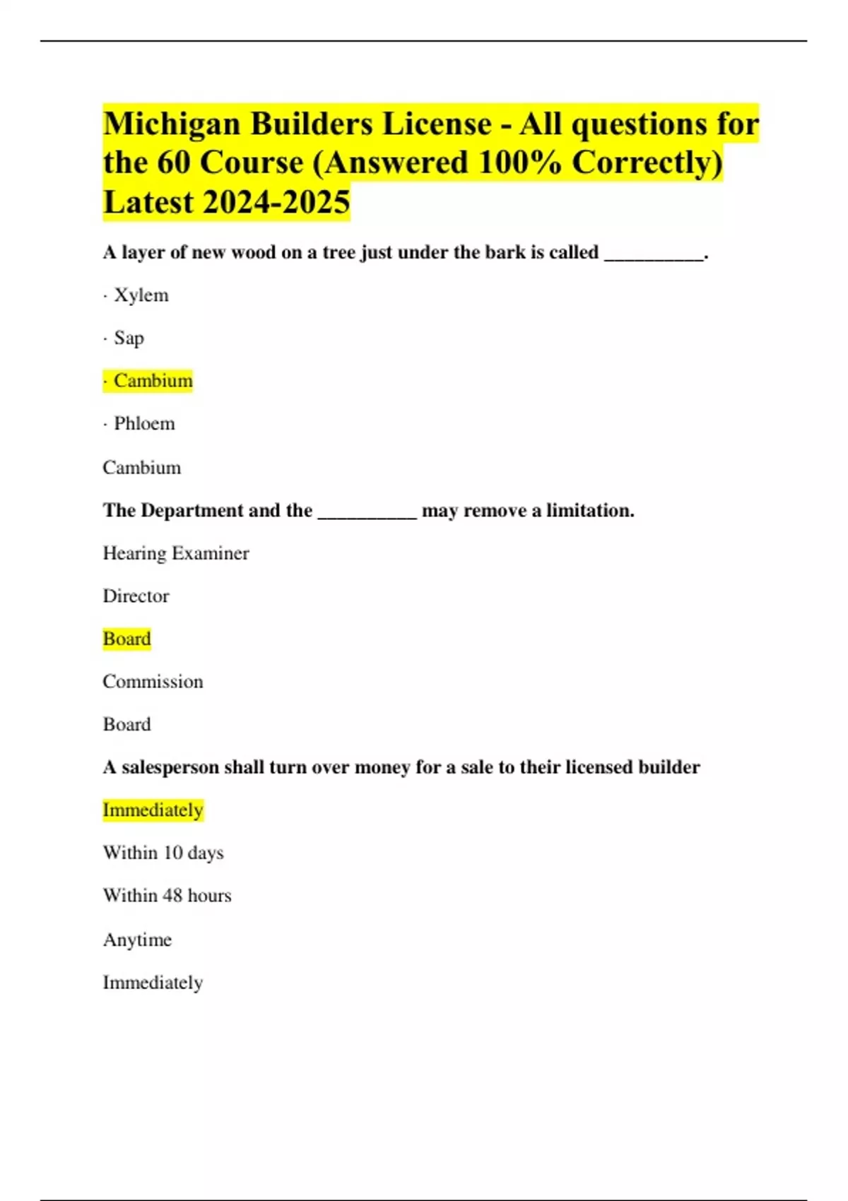 Michigan Builders License Exam|Exam Study Guide|Michigan Builders Exam|Michigan Residential Builder's License Test Bank|Michigan Builders License - All questions for the 60 Course |Questions and Answers, 100% Correct|