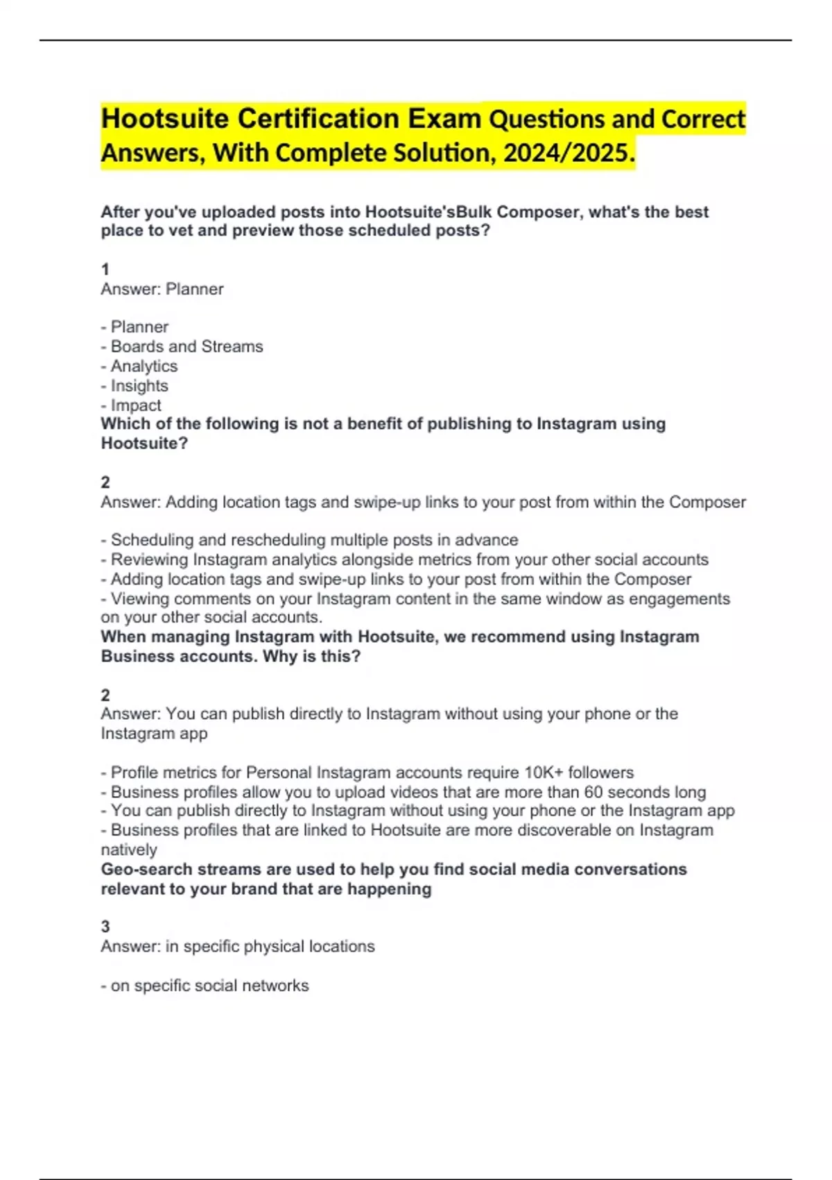Hootsuite Certification Exam Questions and Correct Answers, With Complete Solution, 2024/2025. Hootsuite Platform Certification Exam Questions and Correct Answers, With Complete Solution. Hootsuite Certification Exam, 59 Questions and Correct Answers, With Complete Solution 2024. Hootsuite Certification exam study guide, Questions and Correct Answe