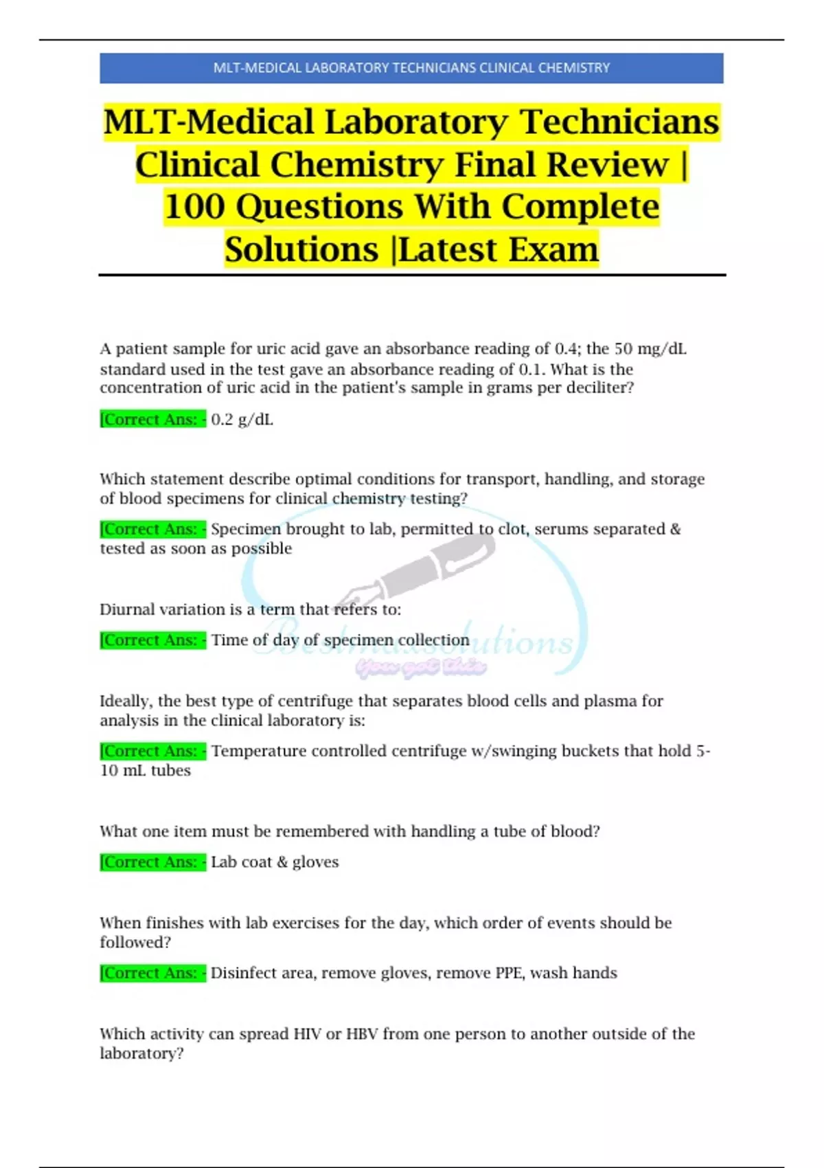 (Complete) MLT- Medical Laboratory Technicians Clinical Chemistry/MLT 230 Clinical Chemistry/ MLT-130 Clinical Chemistry Final Exam| All Questions With Verified Answers Assured Guide,(Complete) MLT- Medical Laboratory Technicians Clinical Chemistry/MLT 230 Clinical Chemistry/ MLT-130 Clinical Chemistry Final Exam| All Questions With Verif