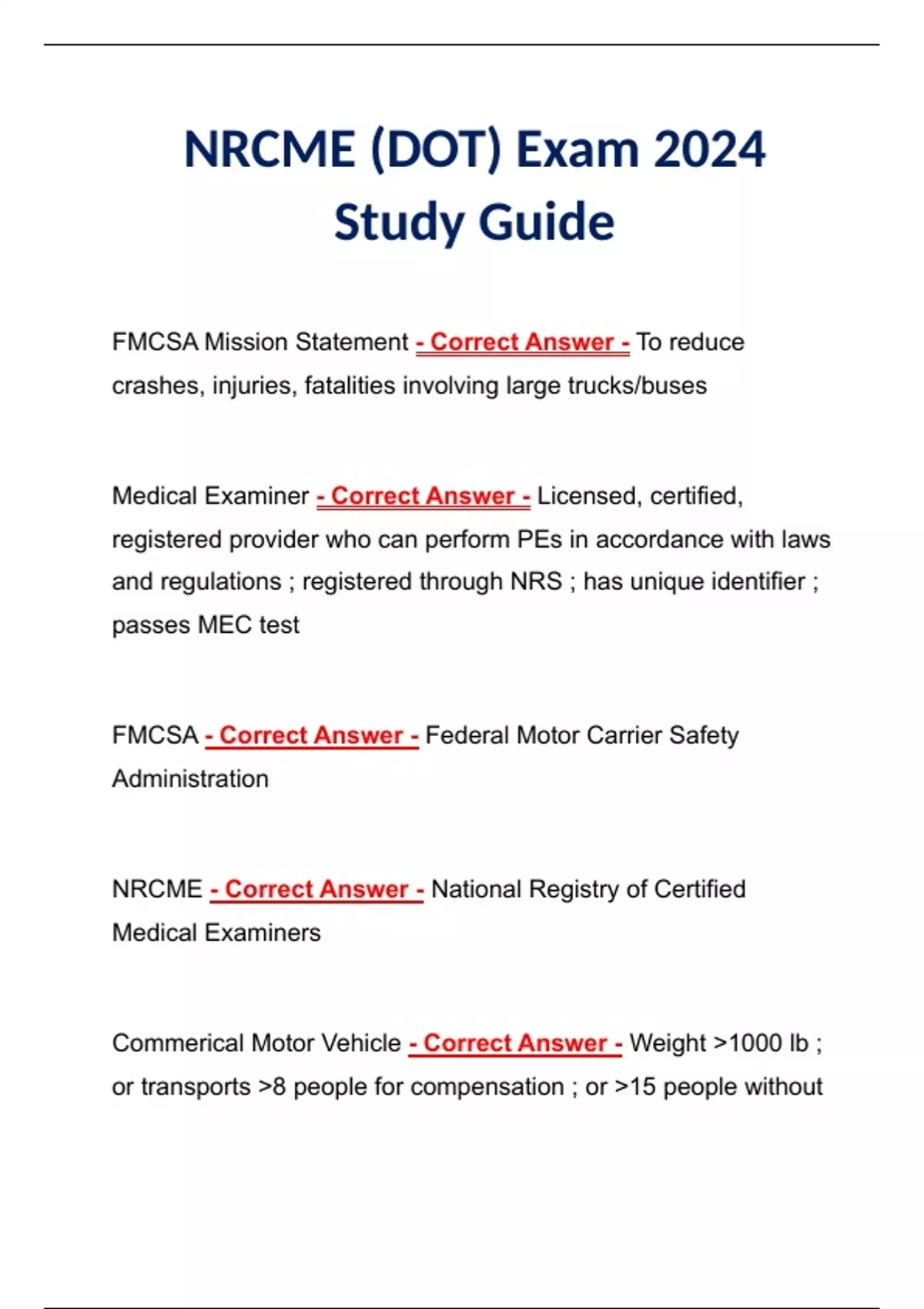 BUNDLE for NRCME DOT Practice question bank | Answered A+ 2024 | NRCME Exam Study Guide 2024 Rated and Graded A+
