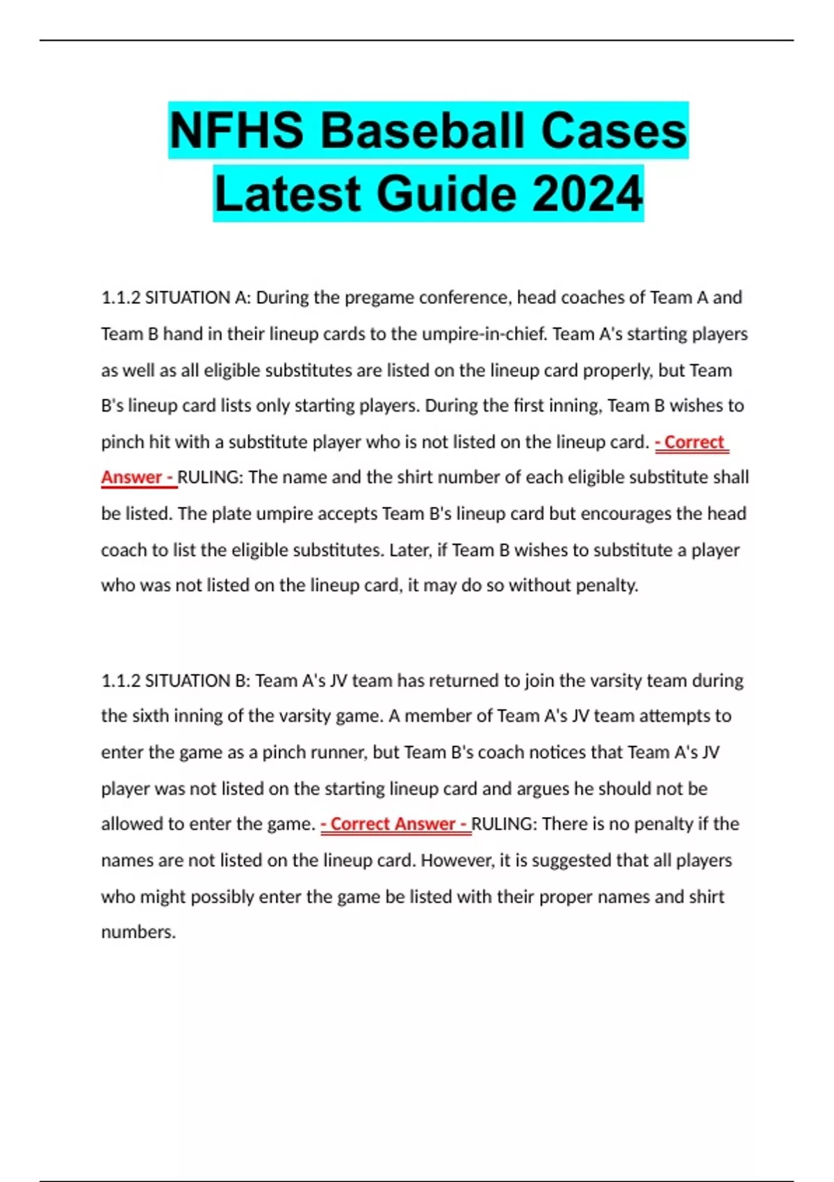 NFHS Baseball Rules Practice Questions and Answers Graded A+ 2024