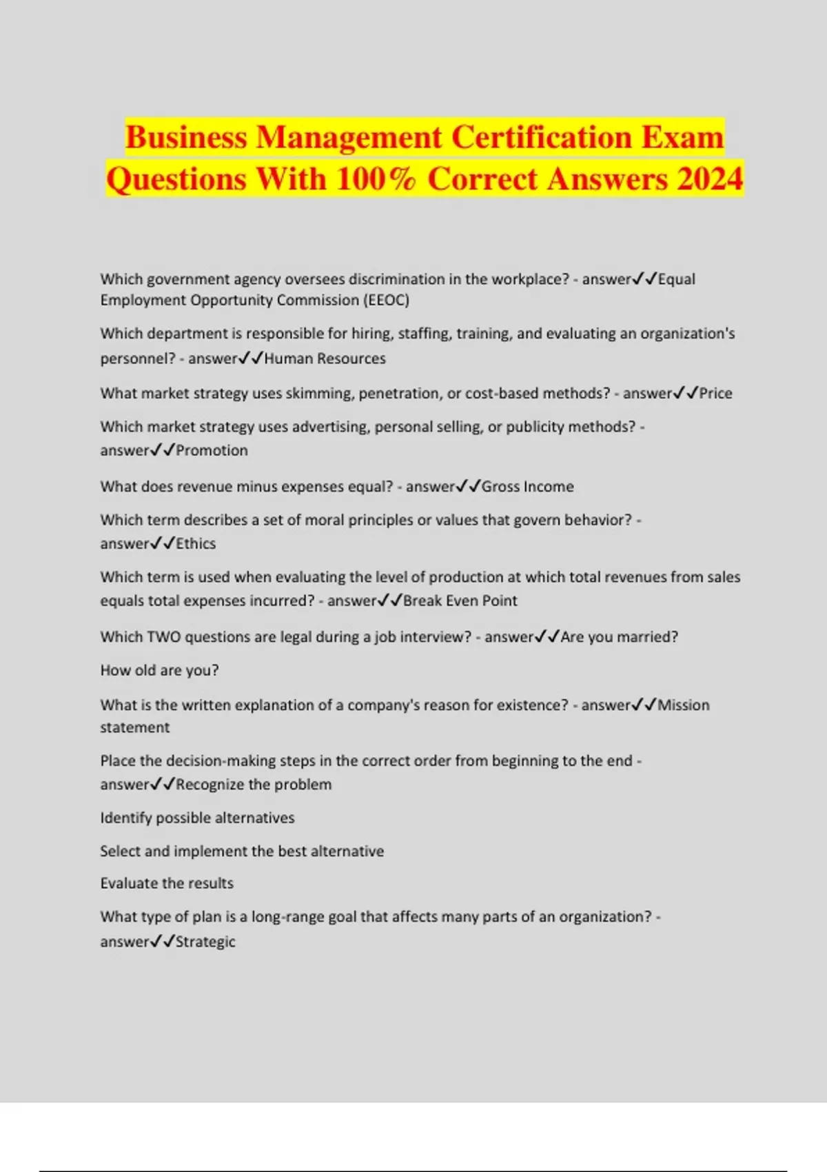 Business Management Certification Exam Questions With 100% Correct Answers 2024