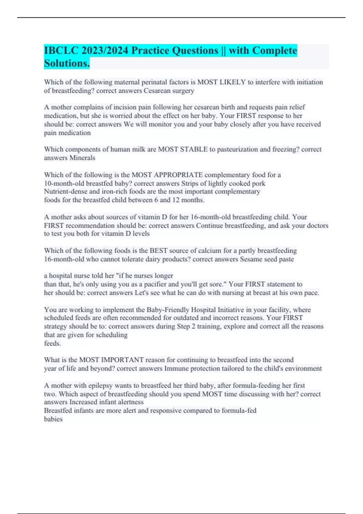 IBCLC 2023/2024 Practice Questions || with Complete Solutions. IBCLC || with 100% Correct Answers. IBCLC - Breastmilk Composition and Function || with 100% Errorless Answers. IBCLC || with 100% Verified Solutions. IBCLC || All Questions Answered Correctly. IBCLC || Questions and 100% Accurate Answers. IBCLC || with Error-free Solutions. IBCLC || wi
