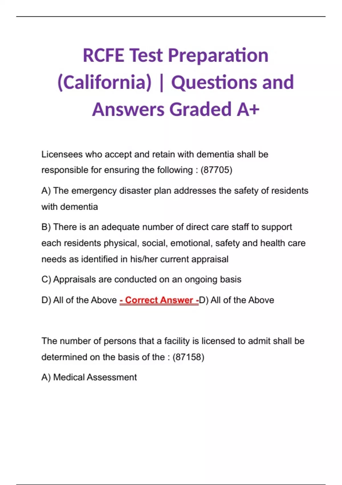 RCFE Test Preparation (California) | Questions and Answers Graded A+
