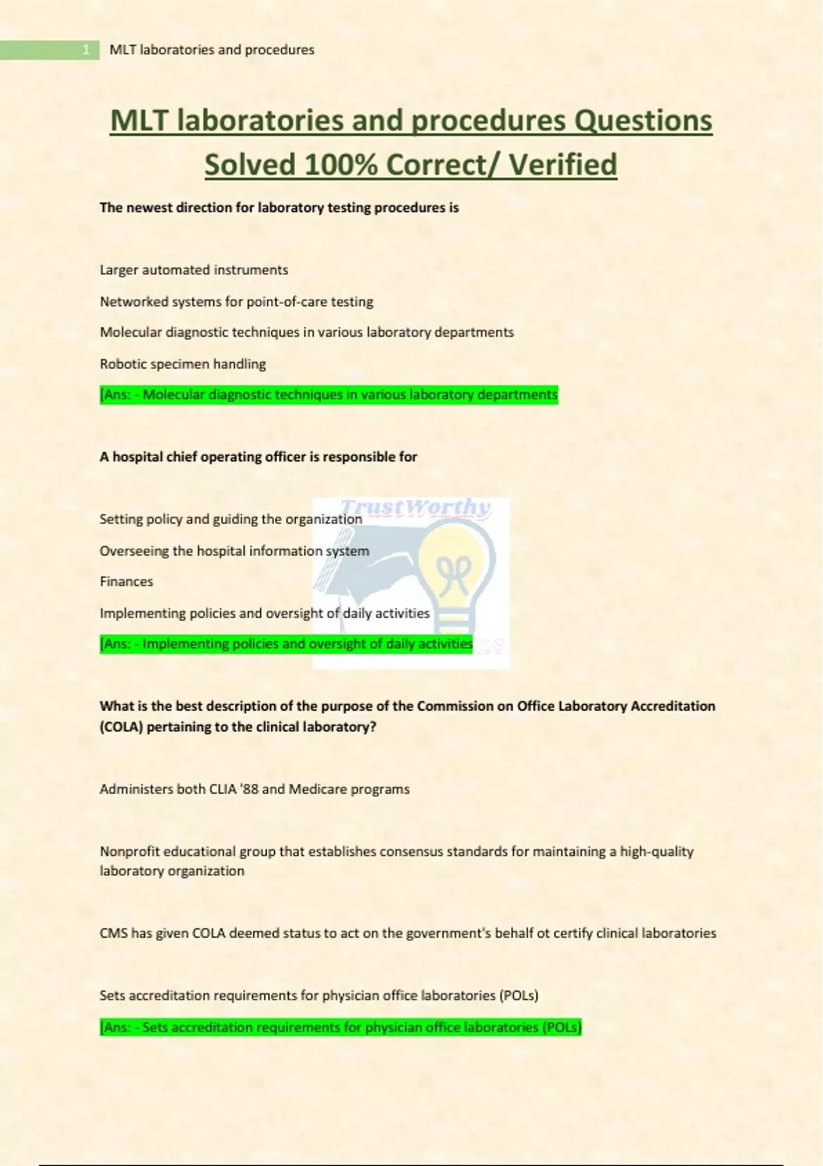 Inclusive; MLT laboratories and procedures |MLT Laboratory Operations BOC Exams Solved 100% correct