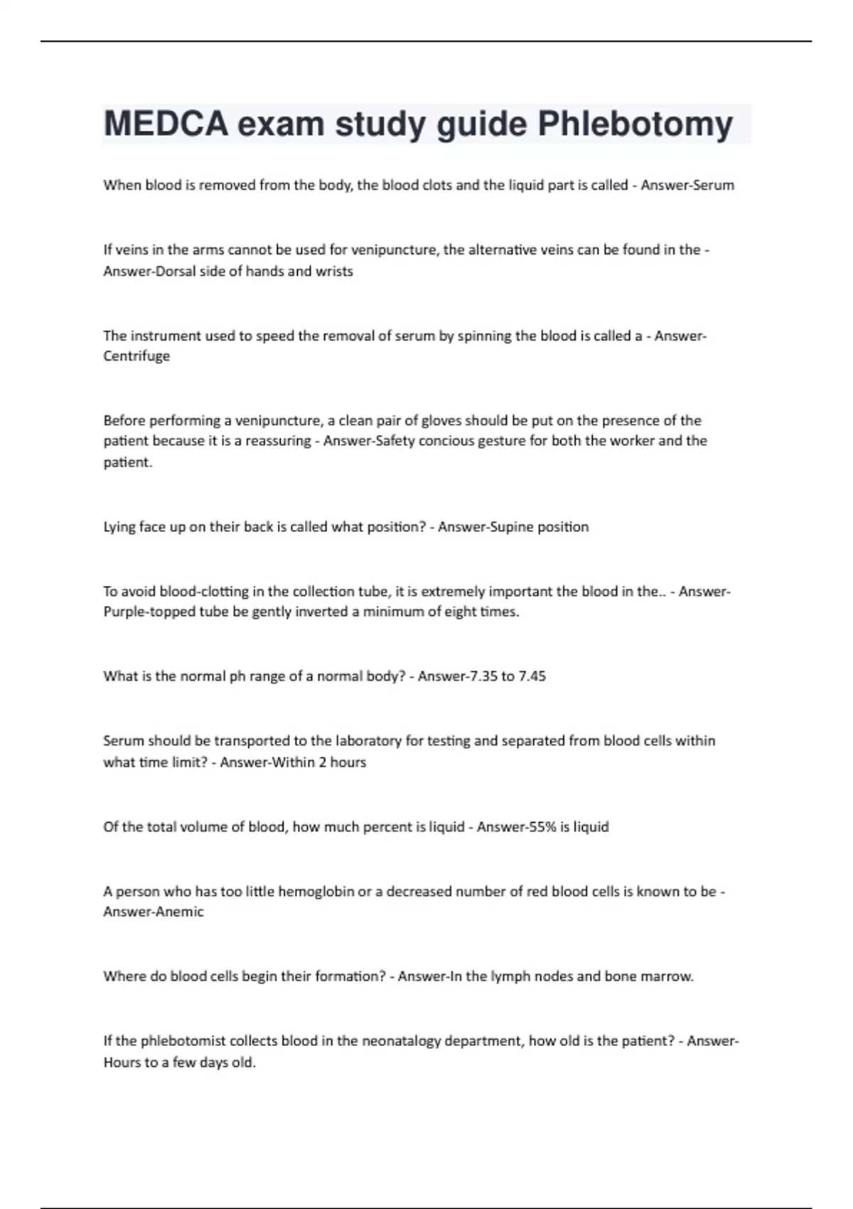 MEDCA exam study guide Phlebotomy Questions With Correct Answers!!