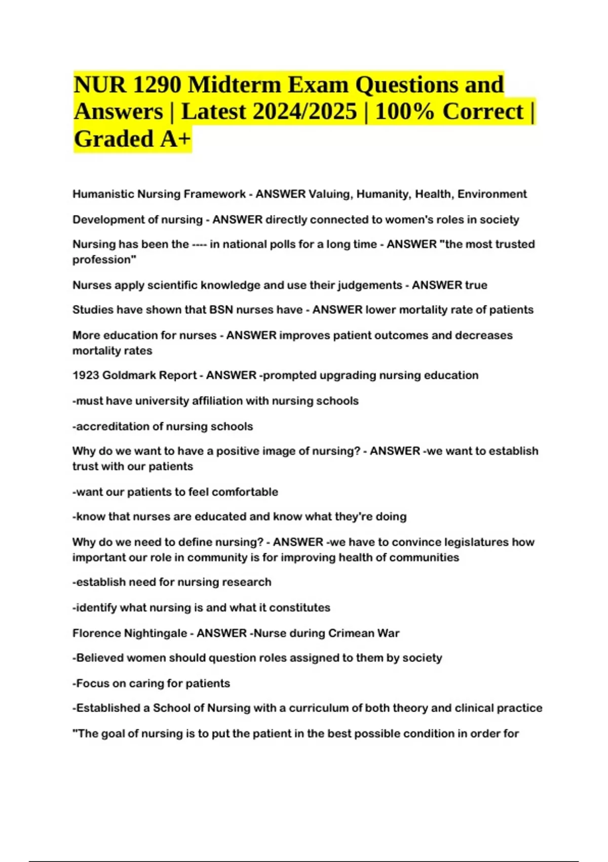 NUR 1290 Midterm Exam Questions and Answers | Latest 2024/2025 | NUR 1290 Exam 2 Questions With Answers Latest and NUR 1290 FINAL QUESTIONS WITH COMPLETE ANSWERS UPDATED 2024 (100% CORRECT)