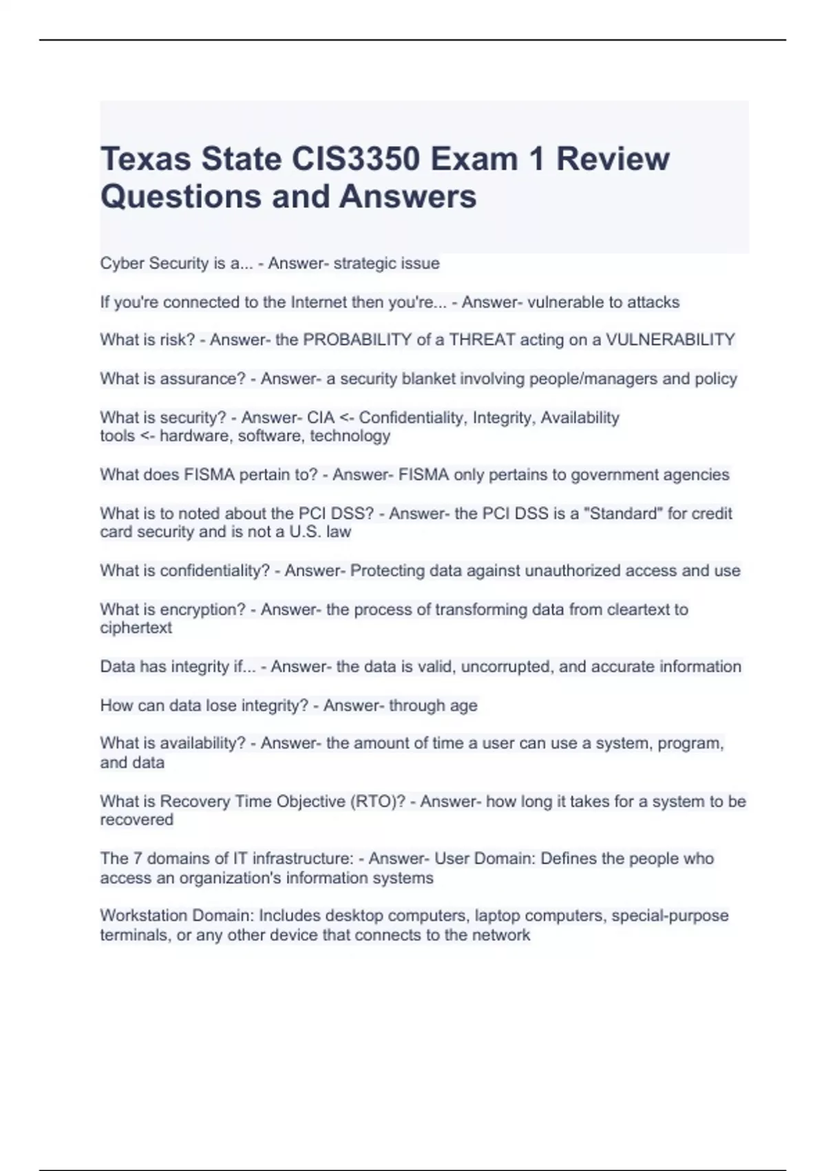 Texas State CIS3350 Exam 1 Review Questions and Answers 2024