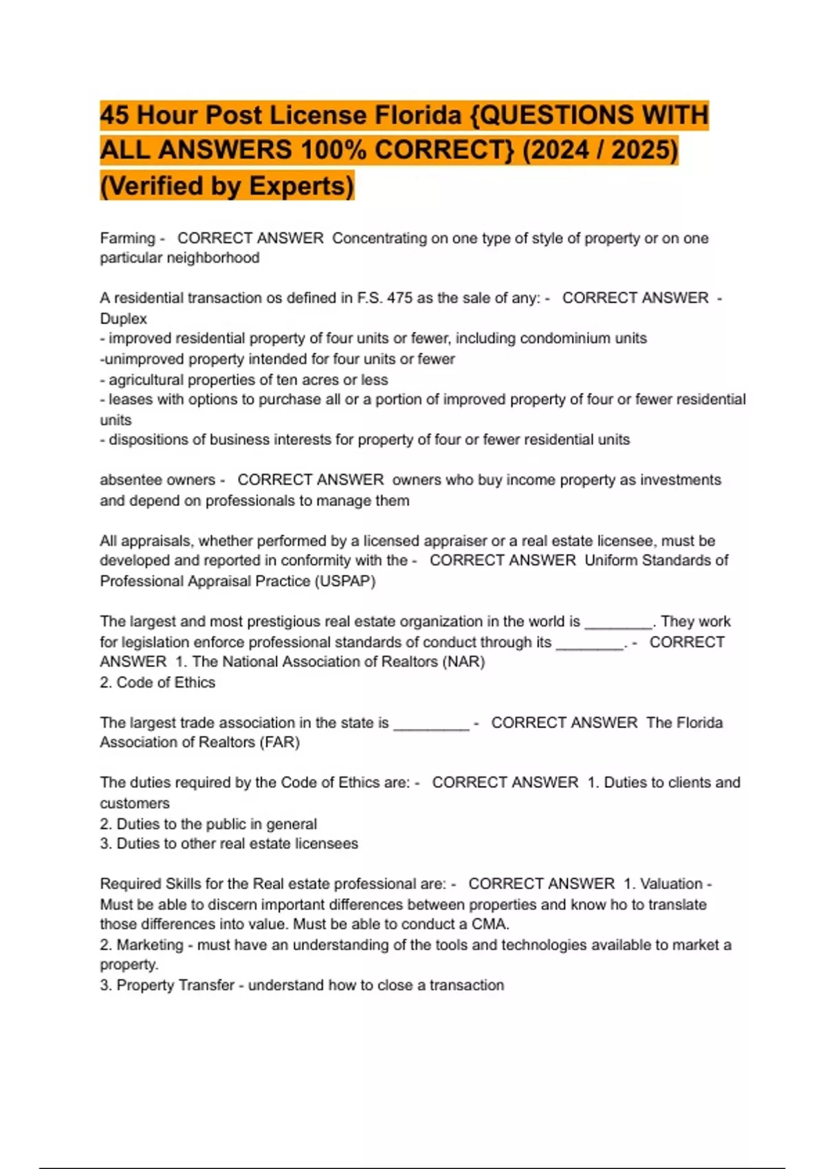 45 Hour Post License Florida EXAM BUNDLE|| ACTUAL EXAMS||| ACTUAL TESTS 2024 || FULL BUNDLE || FULL PACKAGED SOLUTION ( A+ GRADED 100% VERIFIED)