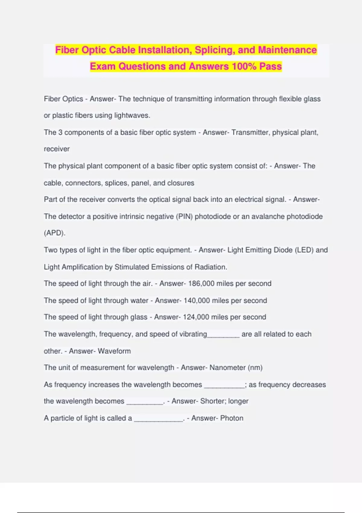 Fiber Optic Cable Installation, Splicing, and Maintenance Exam Questions and Answers 100% Pass