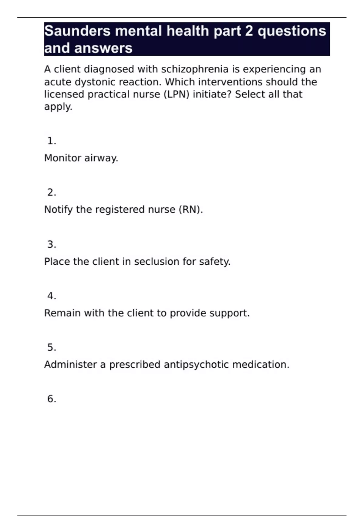 Saunders Immune Health Problems (81 questions and A+ answers ) Schizophrenia Ch.17 Psych Exam2 Questions and Answers Saunders - GI Questions And Answers NUR 205 Saunders Mental Health Questions And Answers MEDSURG II: Saunders Emergency Questions And Answers Saunders Pharm-Psychotherapeutics Questions And Answers NCLEX Practice Questions for Founda