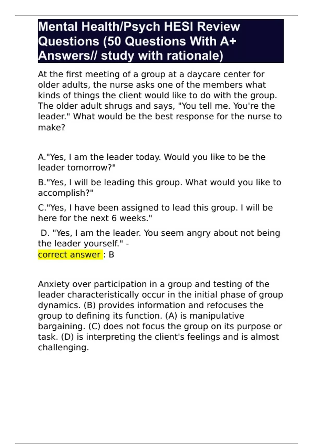 Mental Health/Psych HESI Review Questions (50 Questions With A+ Answers// study with rationale)