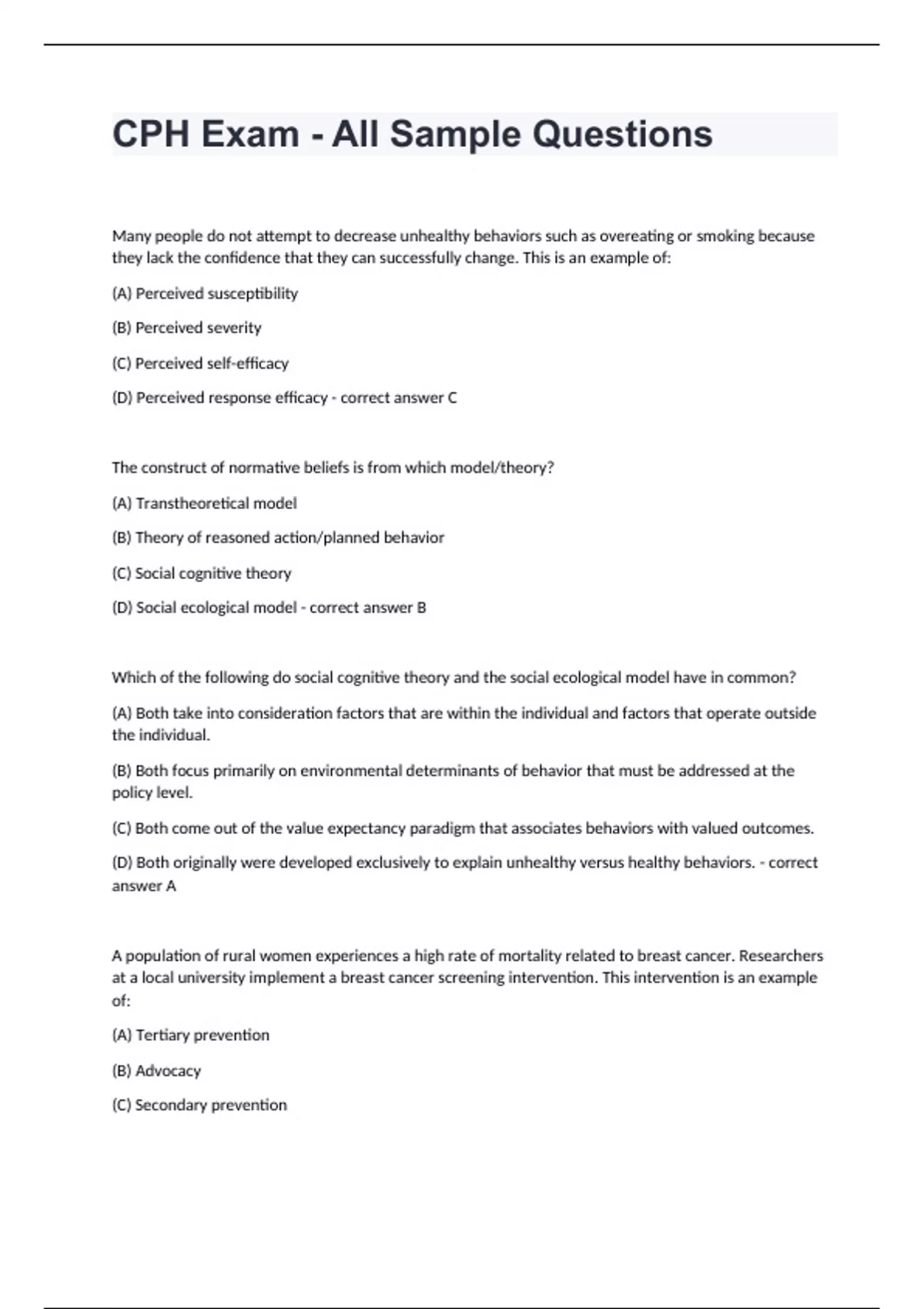1 Exam (elaborations) CPH Exam Chapter 6 Collaboration and PArtnership Complete Answers Already Passed . 2 Exam (elaborations) CPH EXAM Definitions Simplified Study Exam With Accurate Answer. 3 Exam (elaborations) CPH Exam: Environmental Health Sciences Latest Complete Solution Study Guide. 4 Exam (elaborations) Prelim: Intro to CPH Study Guide