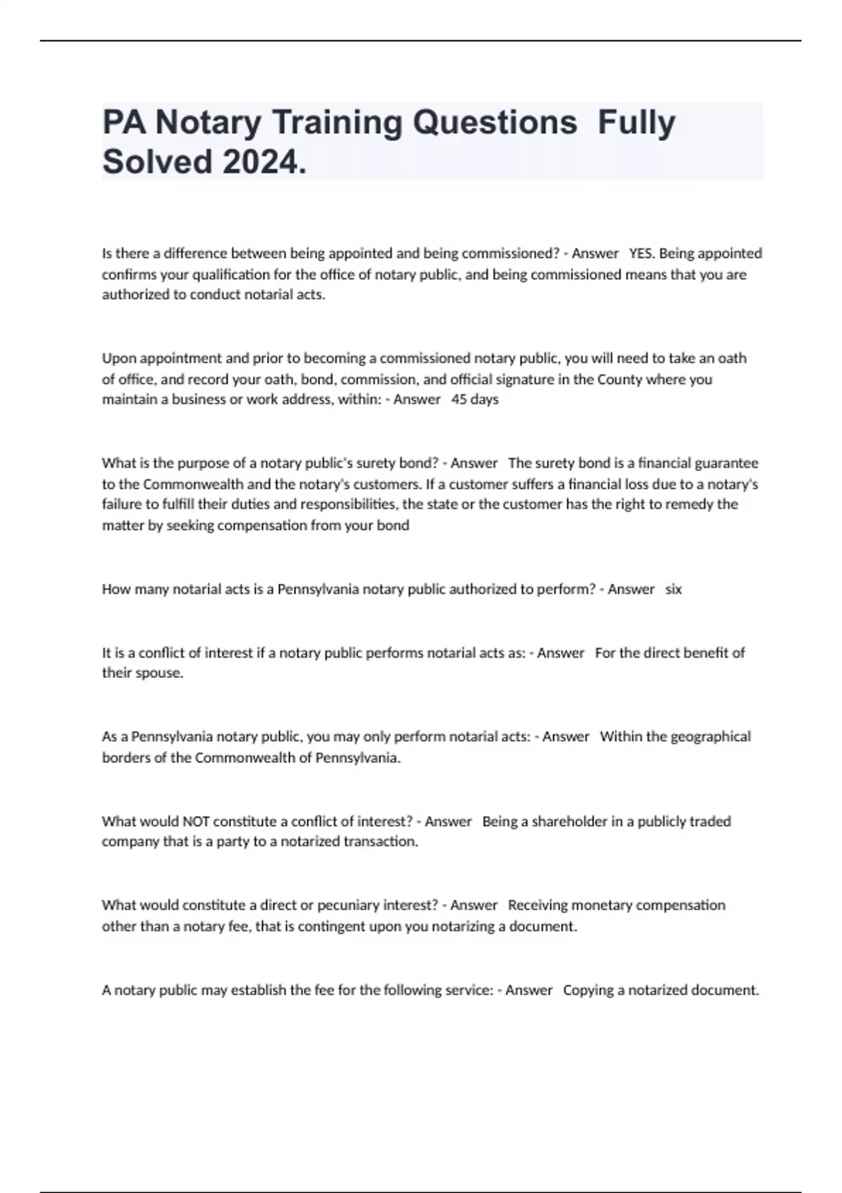 PA Notary Training Questions Fully Solved 2024.