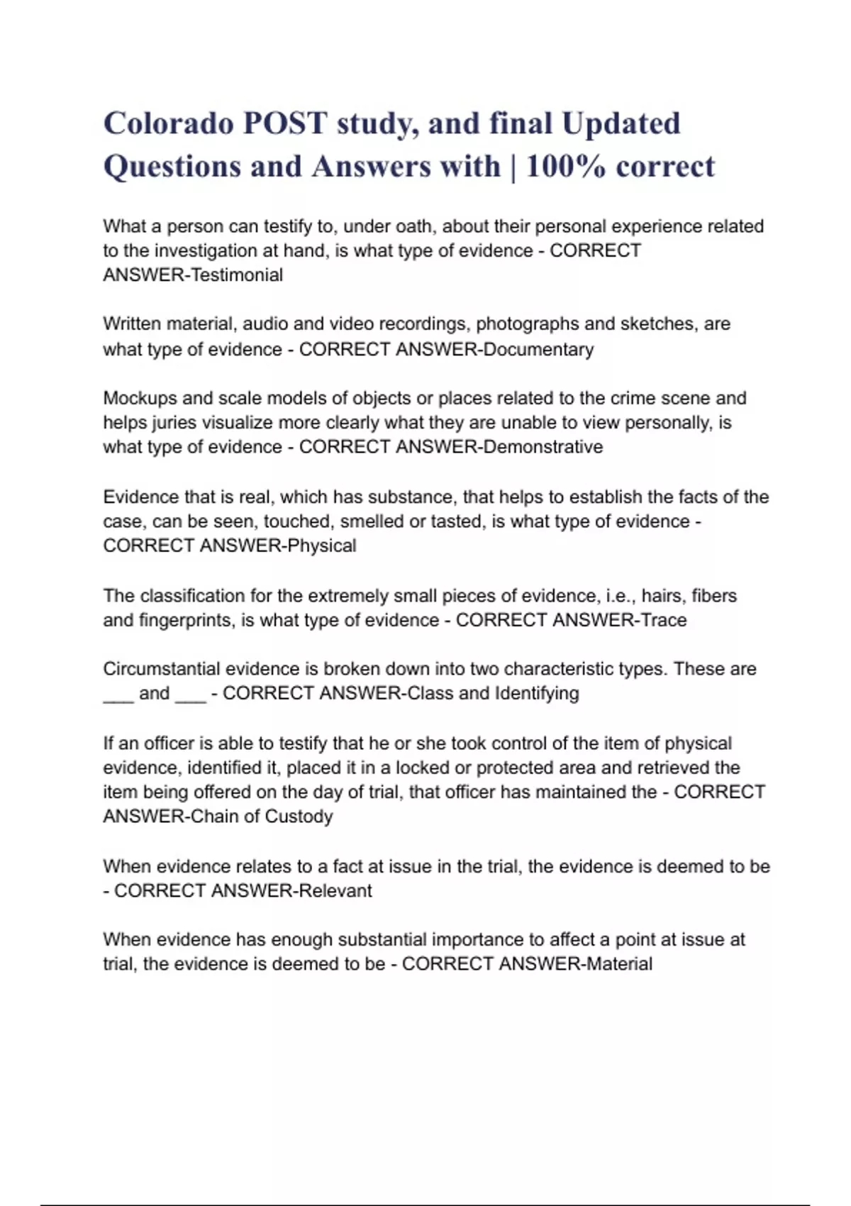 Colorado POST Study Test Questions and Answers |Guarantee Pass