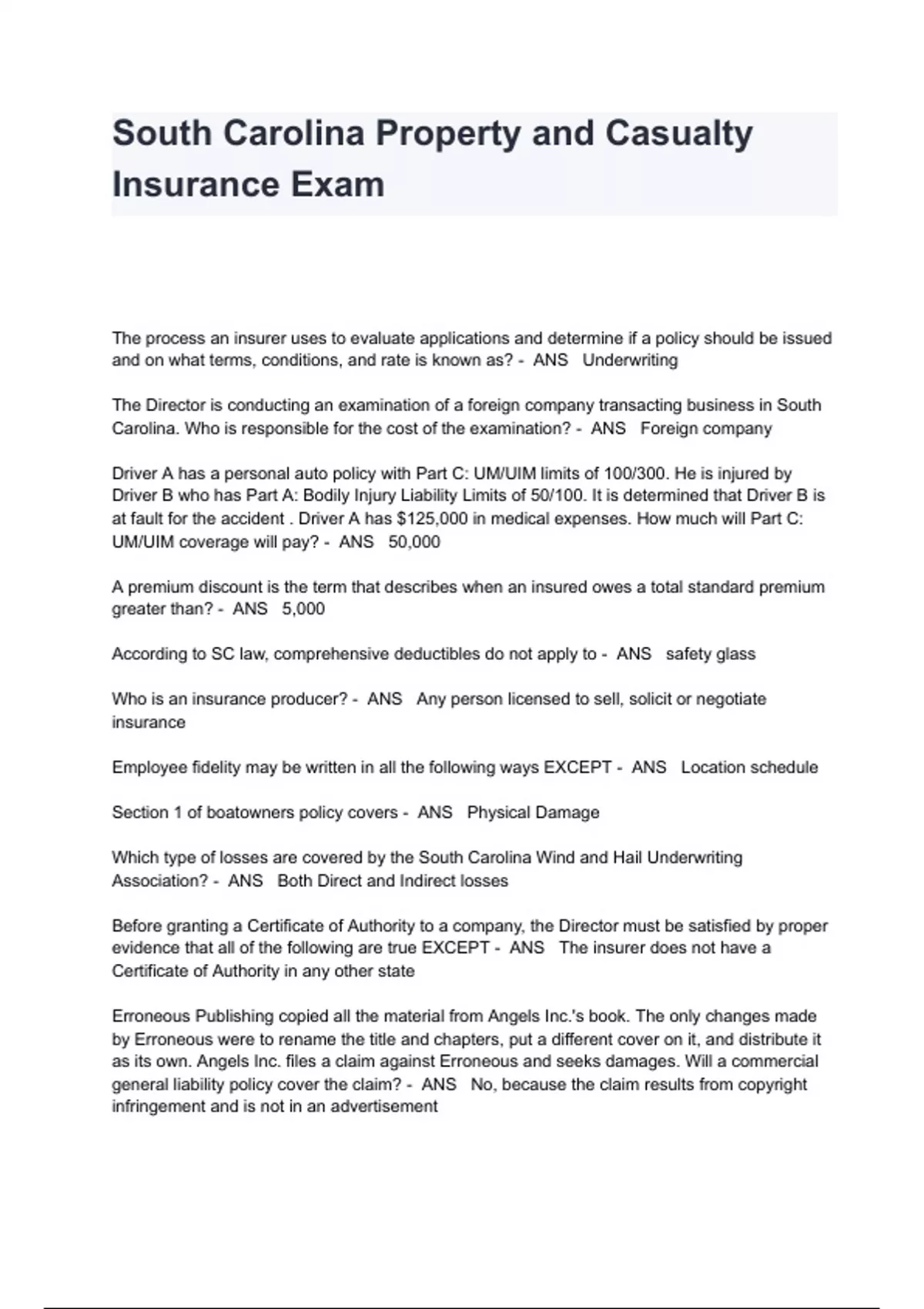 SC P&C Insurance Exam Study Guide Questions And Answers