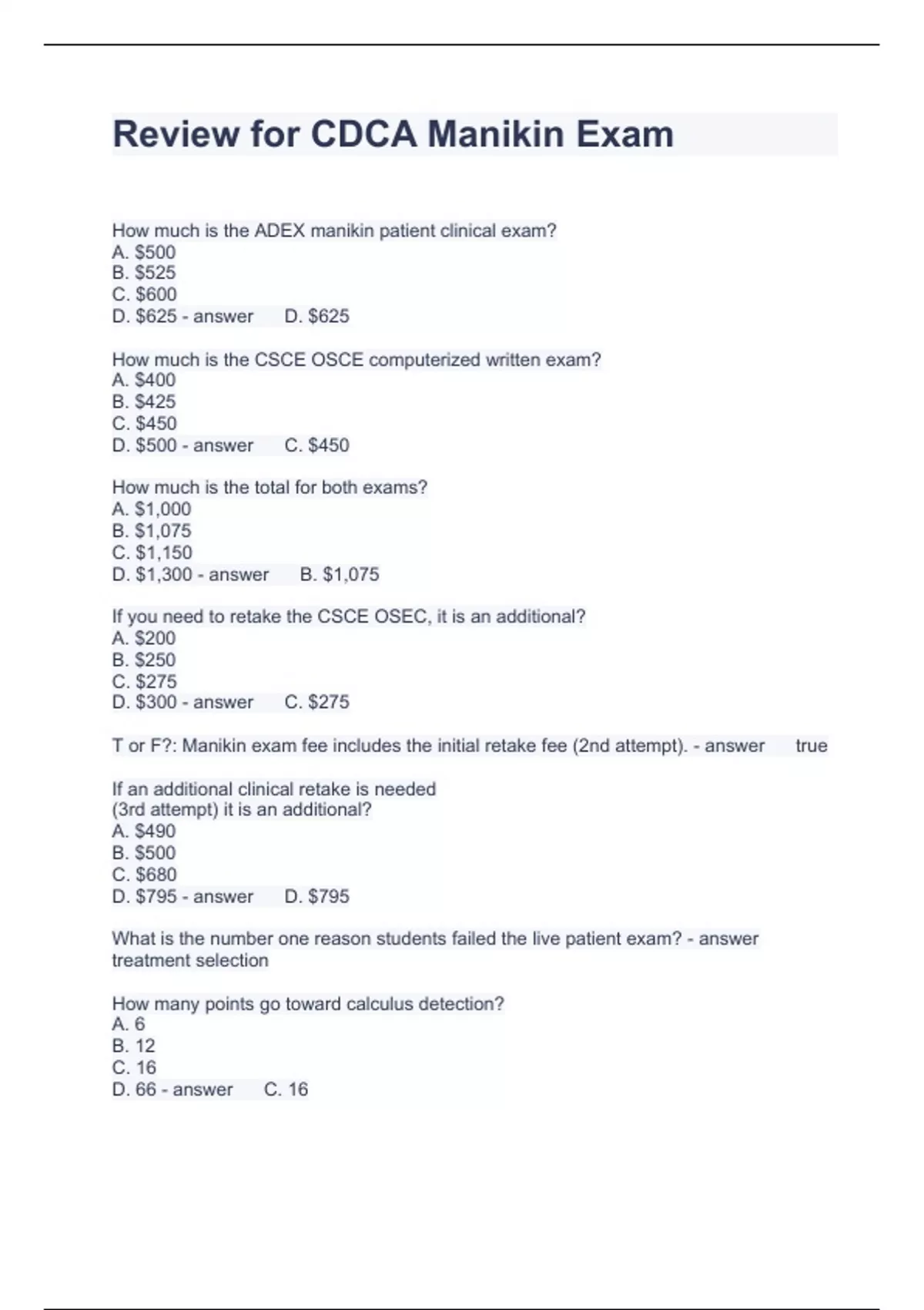 Review for CDCA Manikin Exam Questions and Answers 2024