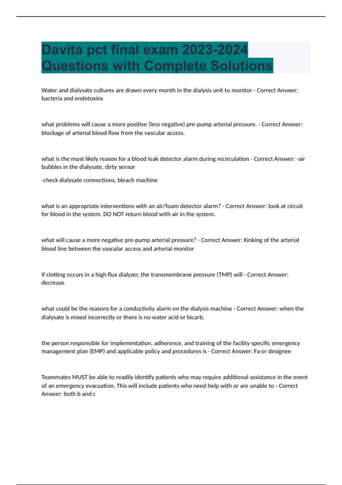 Davita Basic training final Questions with Complete Solutions Bundle Compilation Graded A+