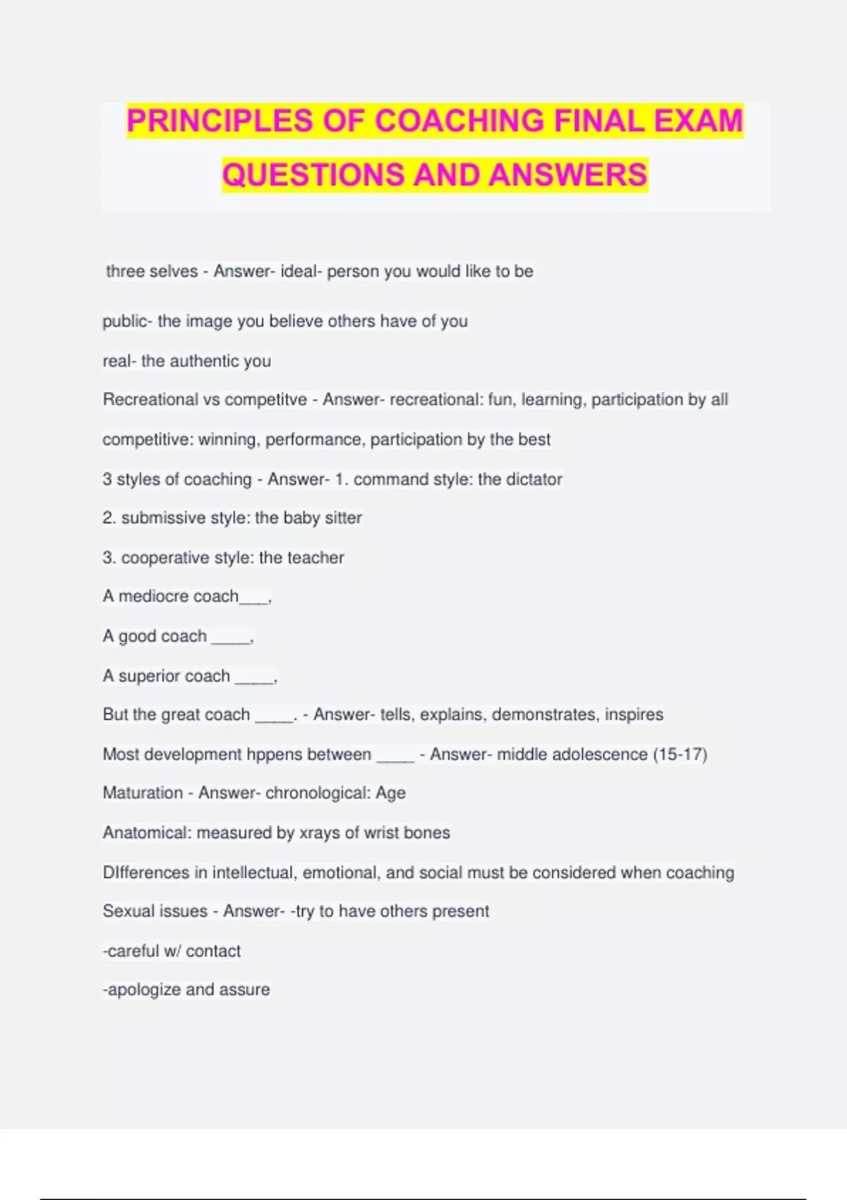 PRINCIPLES OF COACHING FINAL EXAM QUESTIONS AND ANSWERS