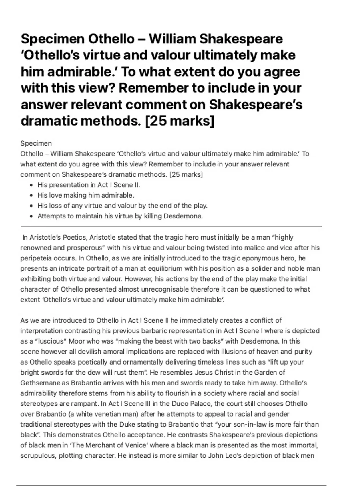 Summary A* AQA ENGLISH LITERATURE OTHELLO ESSAY - Specimen Othello – William Shakespeare ‘Othello’s virtue and valour ultimately make him admirable.’