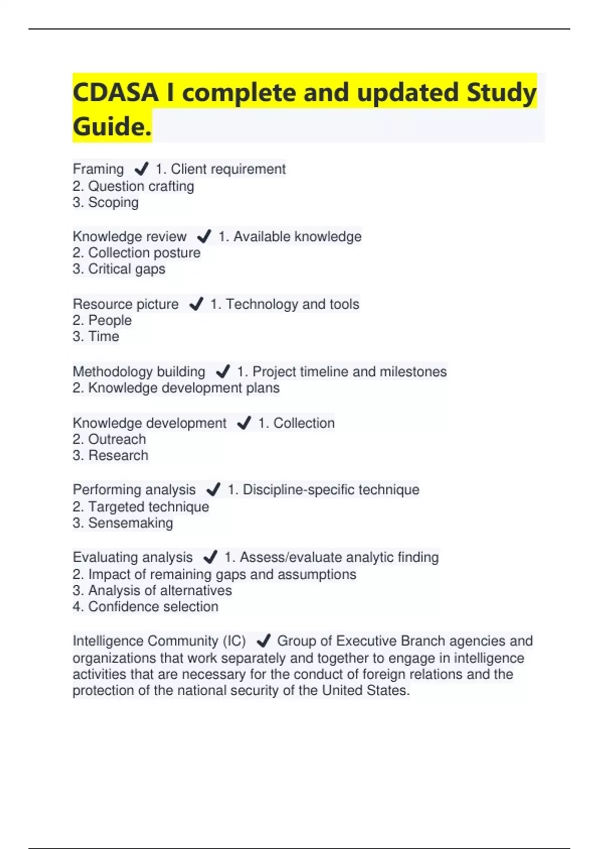 Certified Defense All-Source Analysis (CDASA) Exams PACKAGE DEAL | BUNDLE contains the latest exam solutions, Topic 1-8 test and updated study guide - Everything you need to pass CDASA is here.